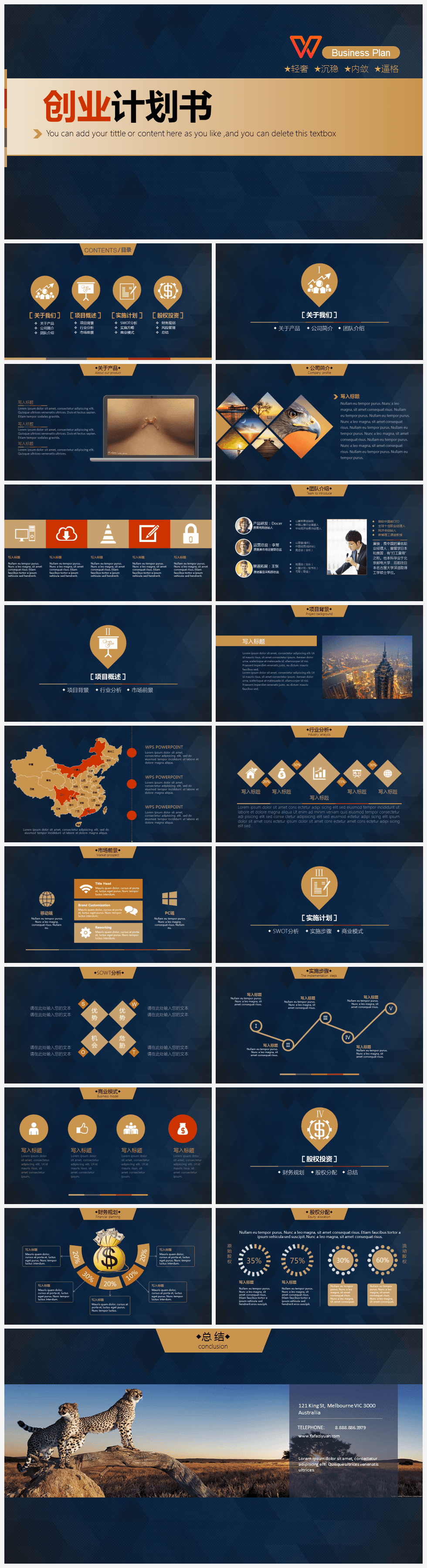 本作品内容为沉稳内敛蓝色简约风创业计划书融资路演PPT模板, 格式为 ppt, 大小31.2 MB, 页数为20,比例自定义, 请使用软件PowerPoint打开, 作品中主体文字及图片可替换修改,文字修改可直接点击文本框进行编辑,图片更改可选中图片后单击鼠标右键选择更换图片,也可根据自身需求增加和删除作品中的内容, 源文件无水印, 欢迎使用发发资源库。 资源下载此资源下载价格为8.8F币,VIP免费,请先登录