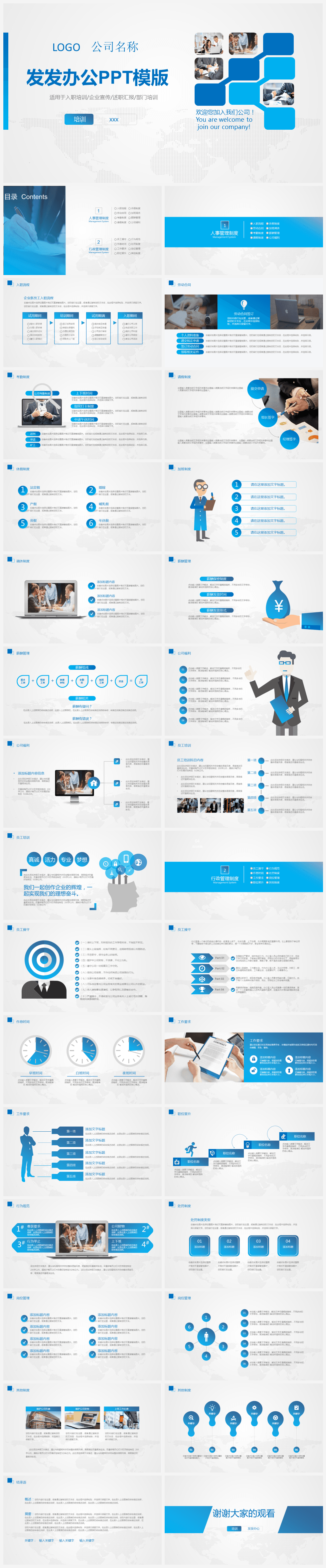 本作品内容为蓝色商务欧美风入职培训述职报告部门培训企业宣传PPT通用模板。 格式为 pptx, 大小16.7MB, 页数为31,比例自定义, 请使用软件PowerPoint打开, 作品中主体文字及图片可替换修改,文字修改可直接点击文本框进行编辑,图片更改可选中图片后单击鼠标右键选择更换图片,也可根据自身需求增加和删除作品中的内容, 源文件无水印, 欢迎使用发发资源库。