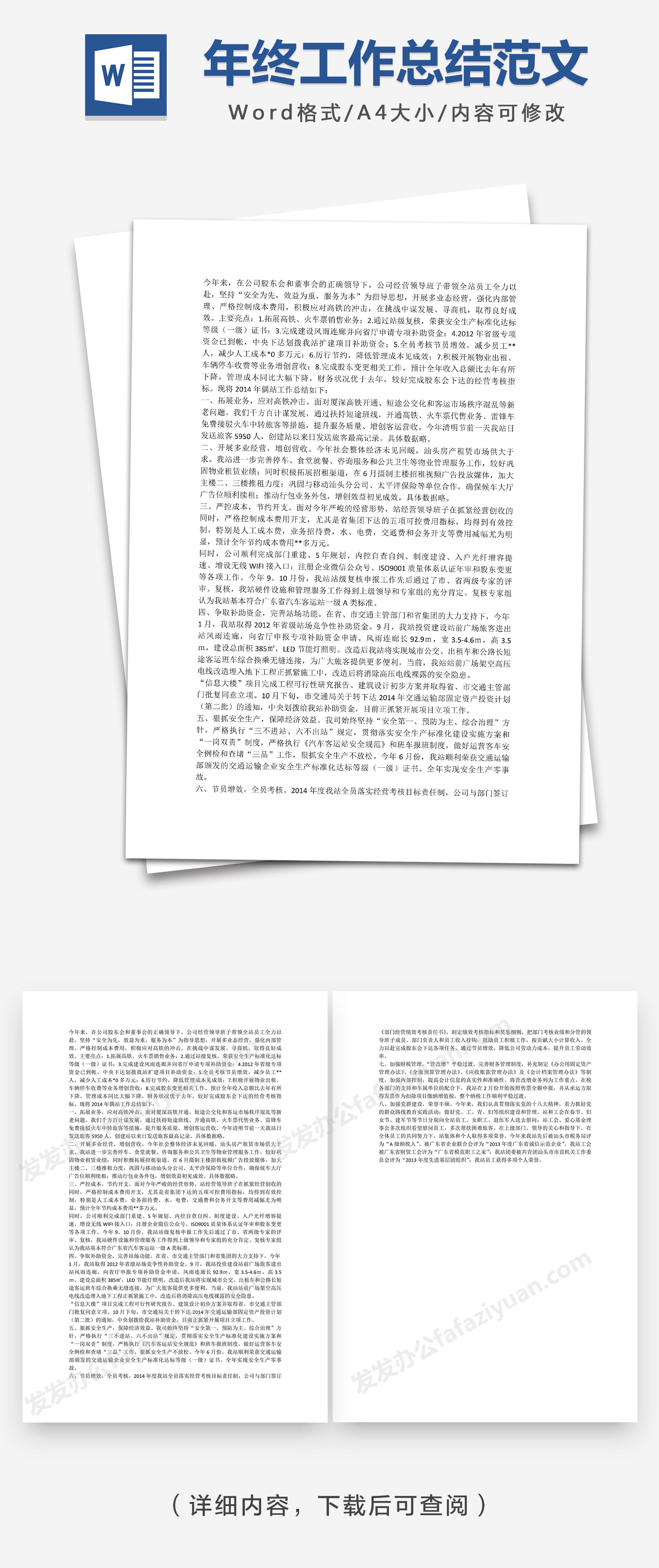 本作品内容为总经理年终工作总结发言稿工作范文word模板免费下载, 格式为 doc, 大小0.035MB, 页数为2, 请使用软件Word打开, 作品中主体文字及图片可替换修改,文字修改可直接点击文本框进行编辑,图片更改可选中图片后单击鼠标右键选择更换图片,也可根据自身需求增加和删除作品中的内容, 源文件无水印, 欢迎使用发发资源库。 资源下载此资源下载价格为8.8F币,VIP免费,请先登录