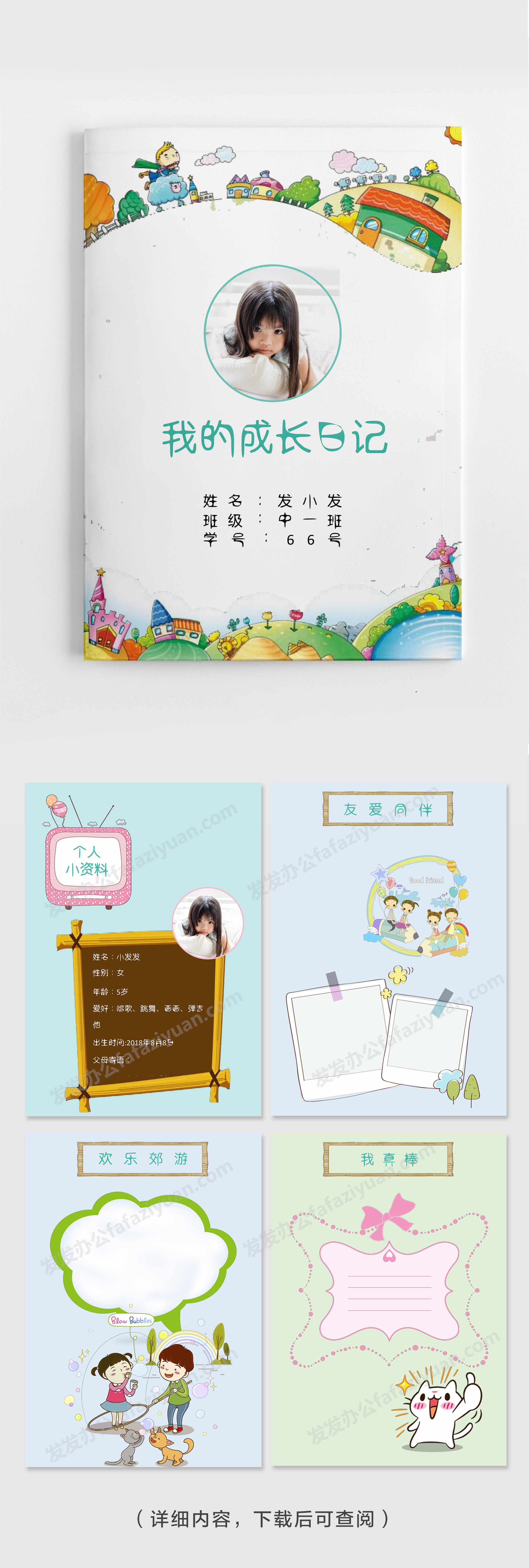 本作品内容为可爱多彩儿童成长档案通用Word模板, 格式为 docx, 大小40.9 MB, 页数为30, 请使用软件Word打开, 作品中主体文字及图片可替换修改,文字修改可直接点击文本框进行编辑,图片更改可选中图片后单击鼠标右键选择更换图片,也可根据自身需求增加和删除作品中的内容, 源文件无水印, 欢迎使用发发资源库。