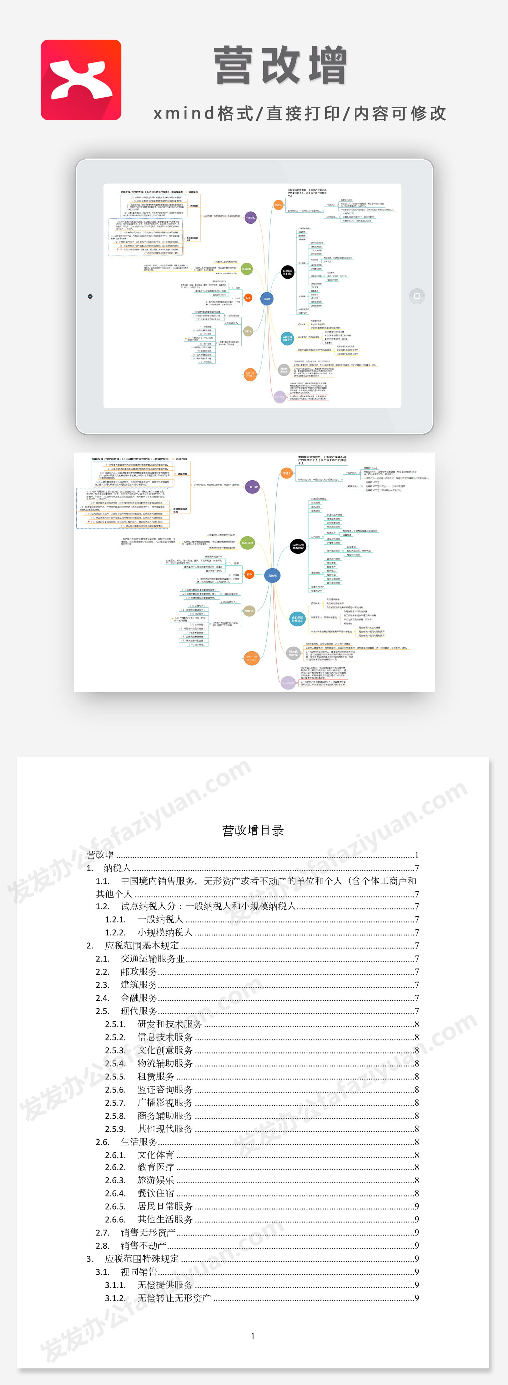 本作品内容为营改增思维导图XMind模板, 格式为 xmind, 大小0.37 MB, 页数为1,内附Word演讲稿笔记。 请使用软件XMind(XMind8)打开, 作品中主体文字及图片可替换修改,文字修改可直接点击文本框进行编辑,图片更改可选中图片后单击鼠标右键选择更换图片,也可根据自身需求增加和删除作品中的内容, 源文件无水印, 欢迎使用发发资源库。 资源下载此资源下载价格为8.8F币,VIP免费,请先登录