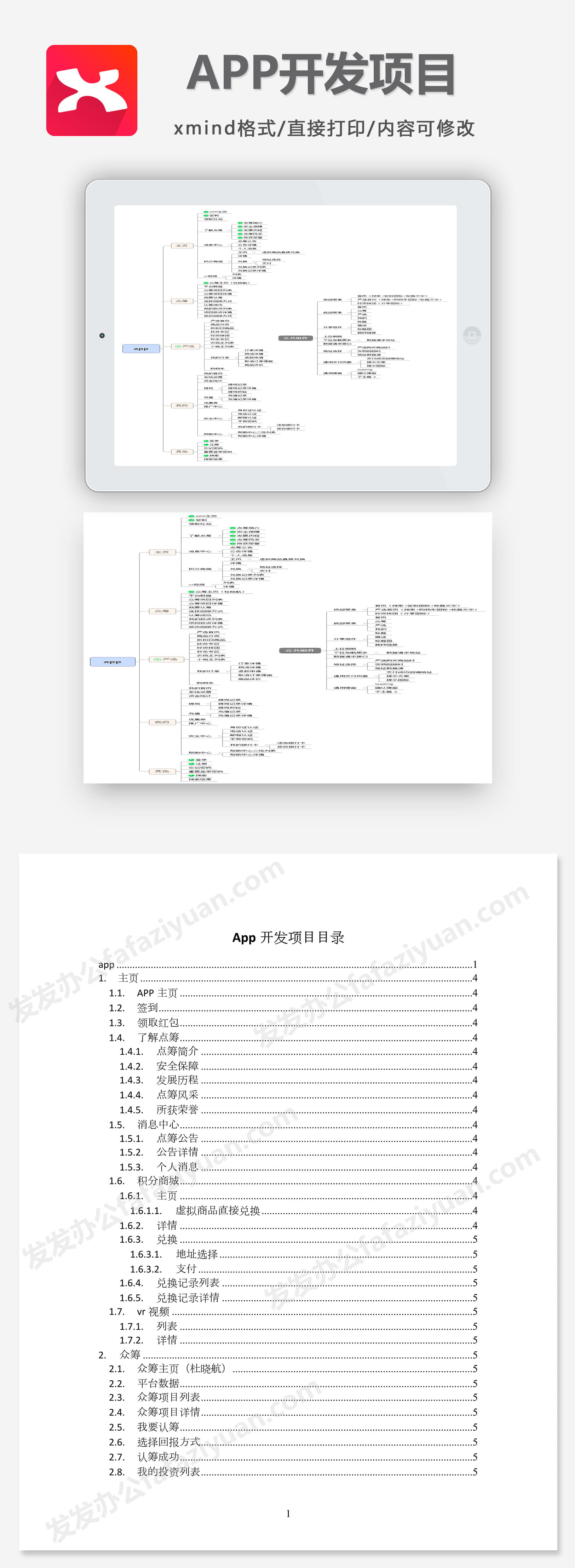 本作品内容为APP开发项目思维导图XMind模板, 格式为 xmind, 大小0.13 MB, 页数为1,内附Word演讲稿笔记。 请使用软件XMind(XMind8)打开, 作品中主体文字及图片可替换修改,文字修改可直接点击文本框进行编辑,图片更改可选中图片后单击鼠标右键选择更换图片,也可根据自身需求增加和删除作品中的内容, 源文件无水印, 欢迎使用发发资源库。