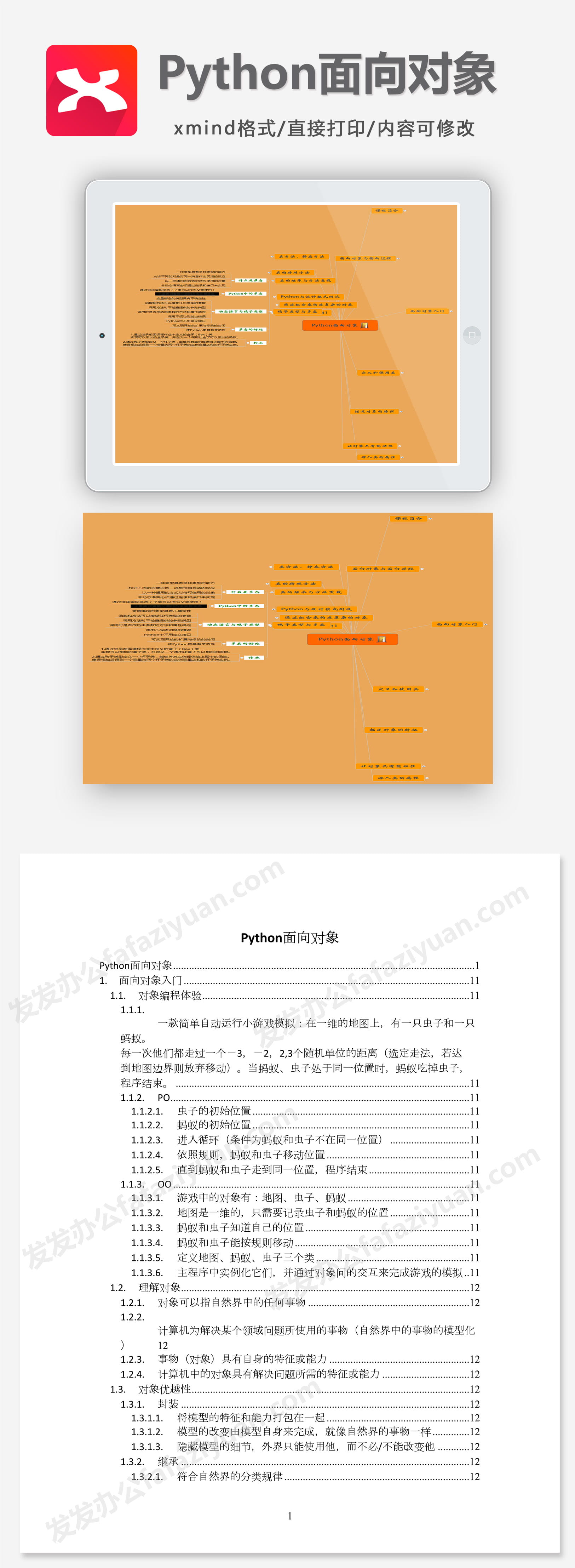 本作品内容为Python面向对象思维导图XMind模板, 格式为 xmind, 大小0.20 MB, 页数为1,内附Word演讲稿笔记。 请使用软件XMind(XMind8)打开, 作品中主体文字及图片可替换修改,文字修改可直接点击文本框进行编辑,图片更改可选中图片后单击鼠标右键选择更换图片,也可根据自身需求增加和删除作品中的内容, 源文件无水印, 欢迎使用发发资源库。
