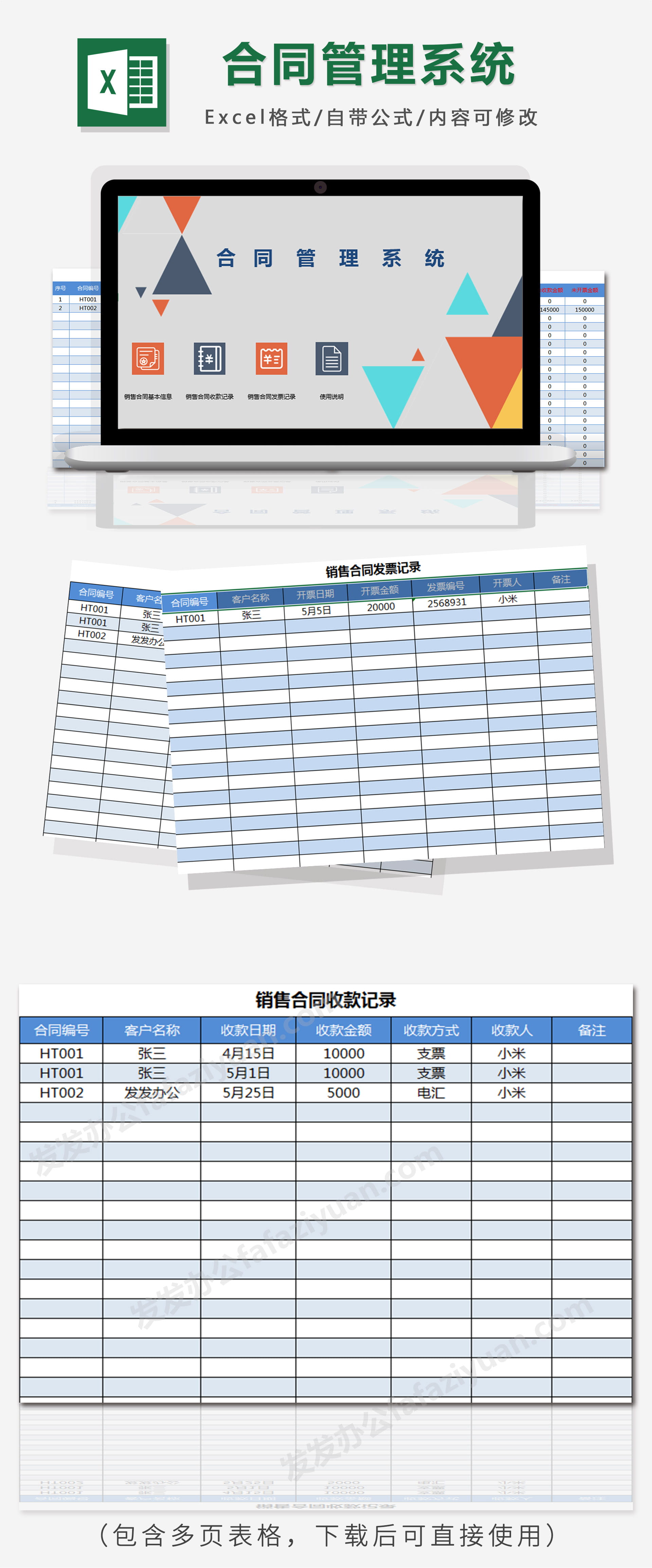 作品内容为合同管理系统发票管理excel表模板, 格式为 xlsx, 大小0.16MB,包含多页表格,下载后可直接使用, 请使用软件Excel打开, 作品中主体文字及图片可替换修改,文字修改可直接点击文本框进行编辑,图片更改可选中图片后单击鼠标右键选择更换图片,也可根据自身需求增加和删除作品中的内容, 源文件无水印, 欢迎使用发发资源库。