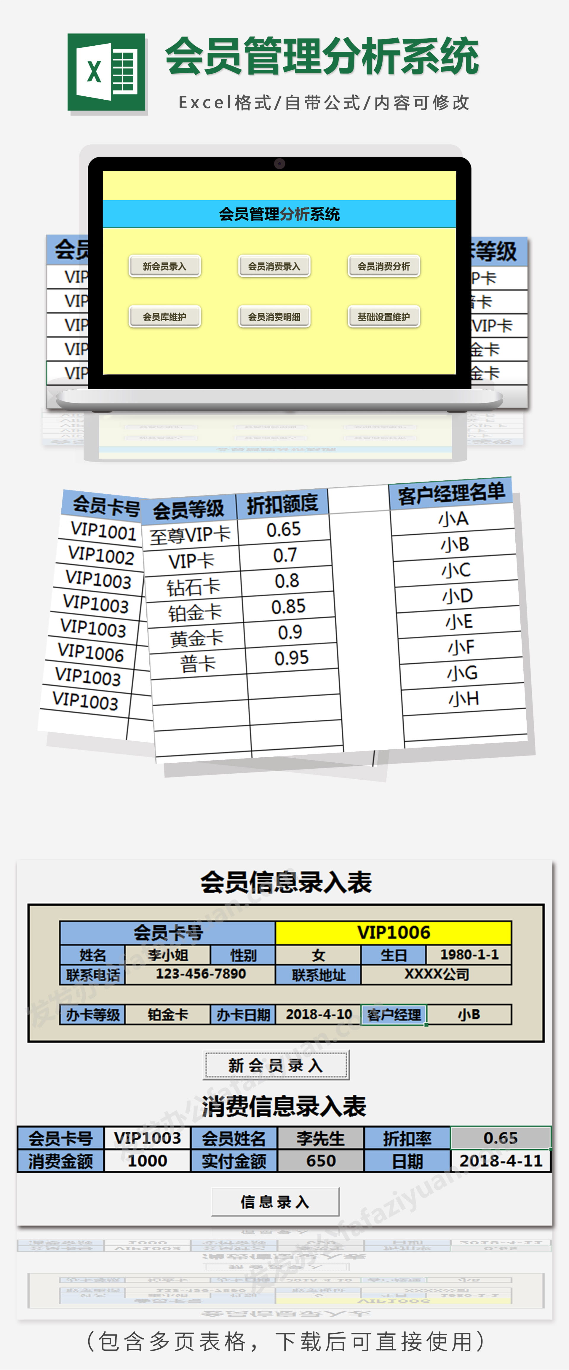 作品内容为简约客户管理分析系统Excel表格模板, 格式为 xlsm, 大小0.14MB,包含多页表格,下载后可直接使用, 请使用软件Excel打开, 作品中主体文字及图片可替换修改,文字修改可直接点击文本框进行编辑,图片更改可选中图片后单击鼠标右键选择更换图片,也可根据自身需求增加和删除作品中的内容, 源文件无水印, 欢迎使用发发资源库。
