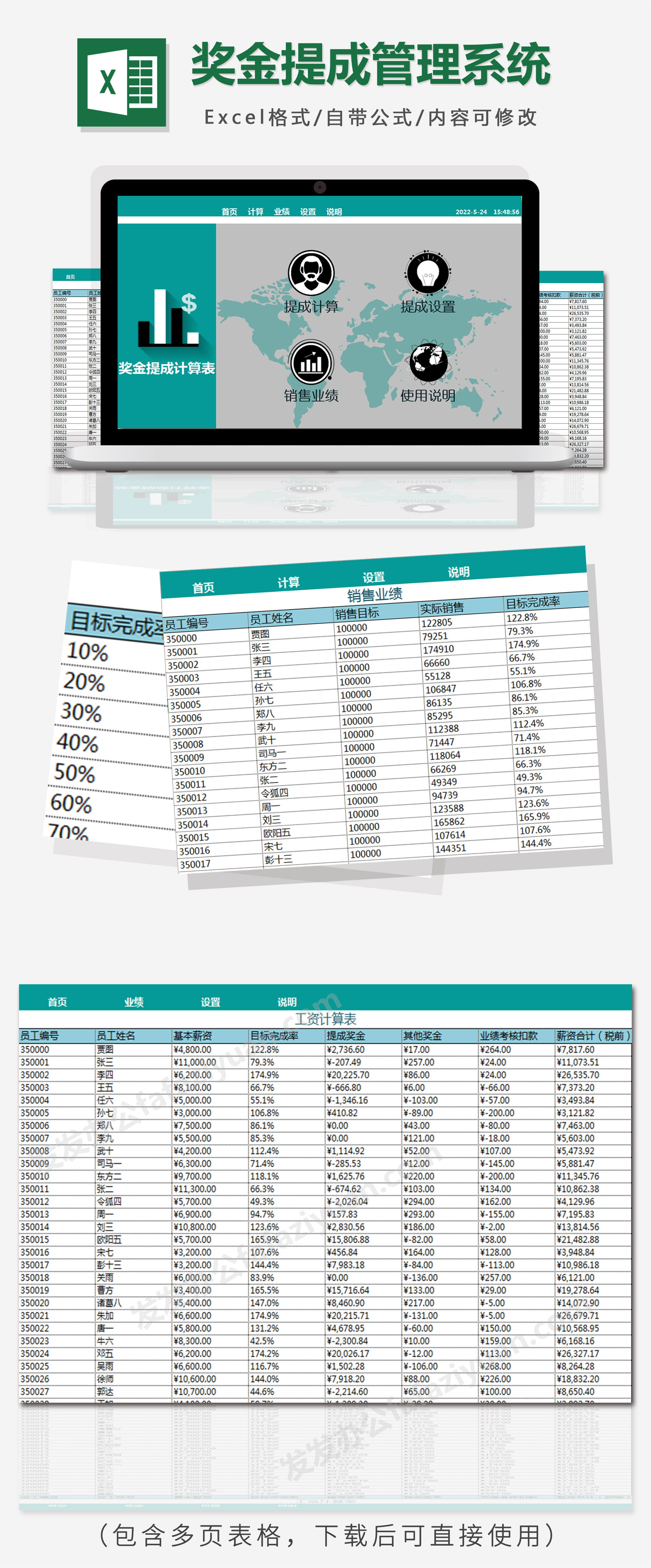 作品内容为简约蓝销售奖金提成计算管理系统Excel表格通用模板, 格式为 xlsx, 大小0.35MB,包含多页表格,下载后可直接使用, 请使用软件Excel打开, 作品中主体文字及图片可替换修改,文字修改可直接点击文本框进行编辑,图片更改可选中图片后单击鼠标右键选择更换图片,也可根据自身需求增加和删除作品中的内容, 源文件无水印, 欢迎使用发发资源库。