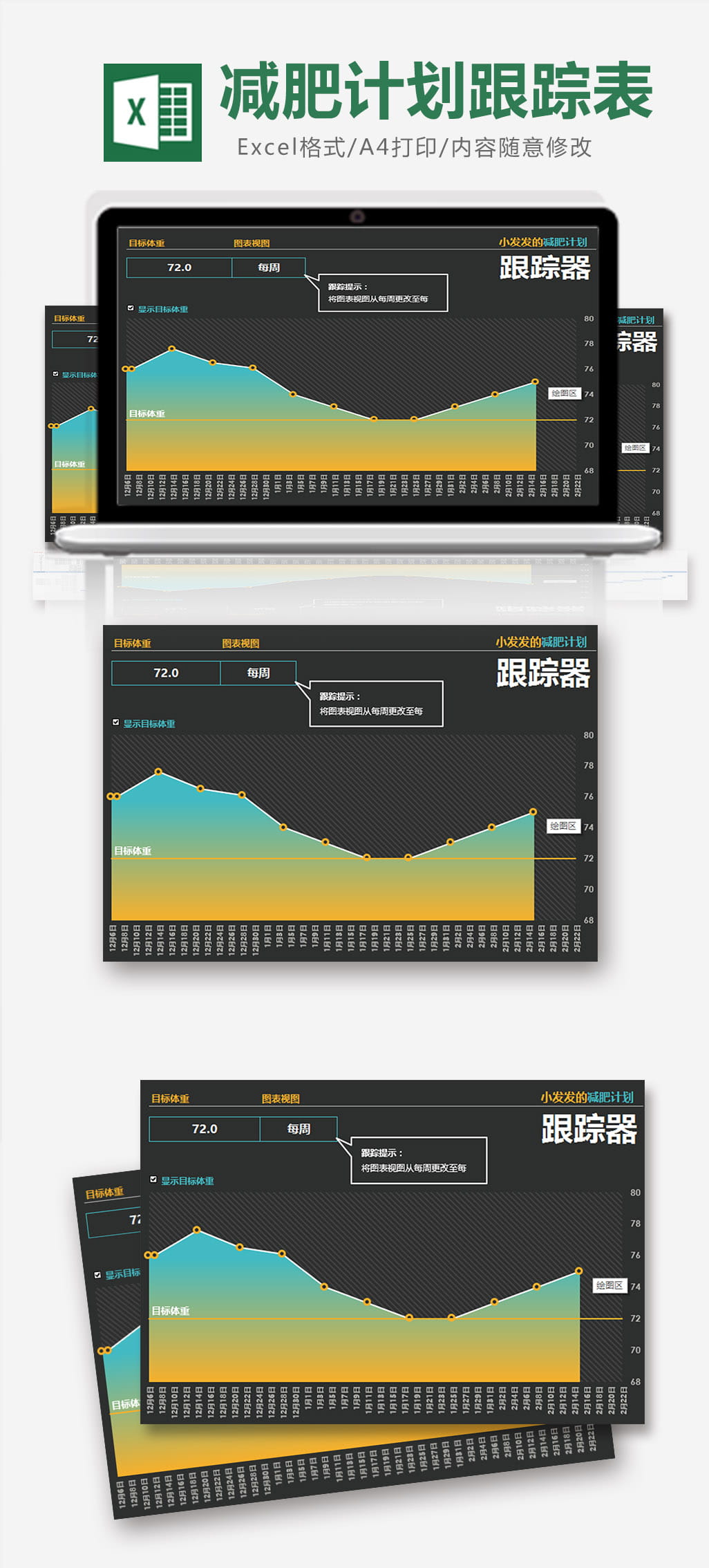 作品内容为个人健身减肥跟踪记录表excel表格模板, 格式为 xlsx, 大小0.033MB,包含多页表格,下载后可直接使用, 请使用软件Excel打开, 作品中主体文字及图片可替换修改,文字修改可直接点击文本框进行编辑,图片更改可选中图片后单击鼠标右键选择更换图片,也可根据自身需求增加和删除作品中的内容, 源文件无水印, 欢迎使用发发资源库。