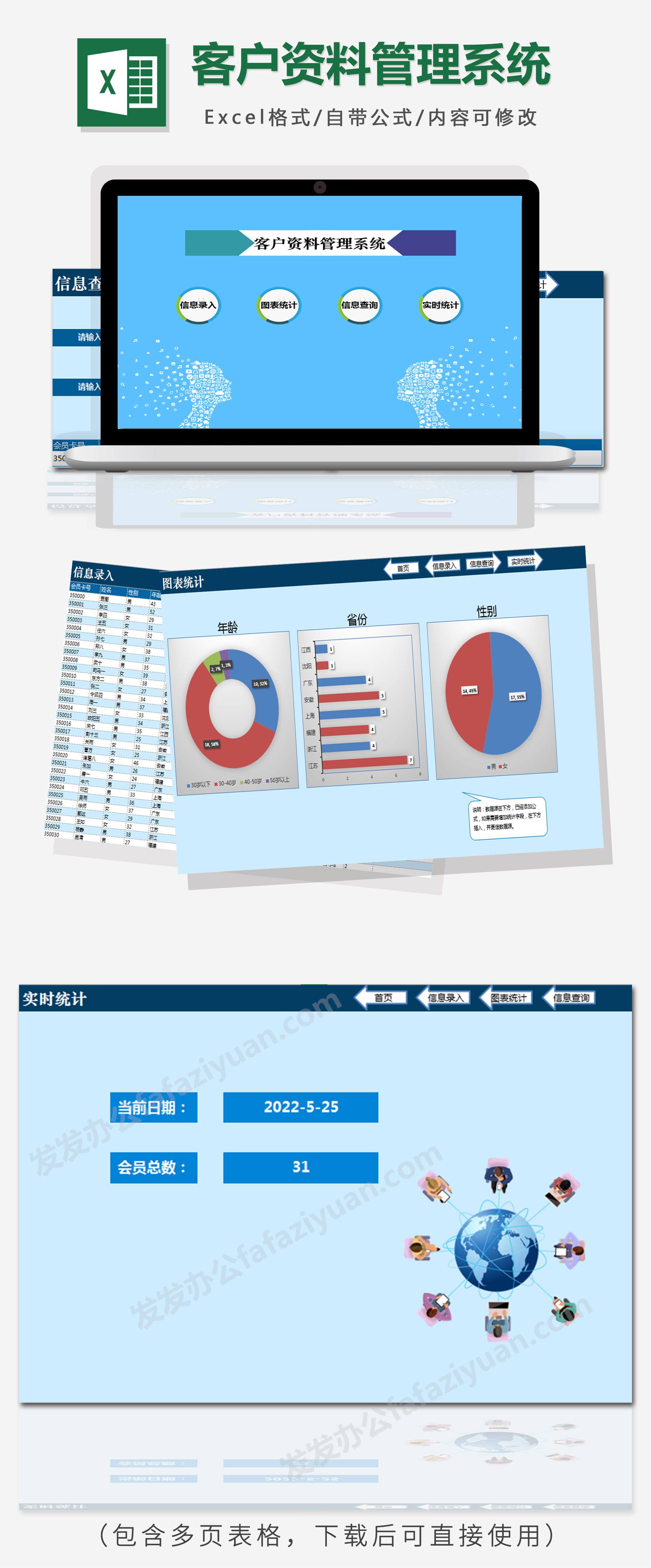 作品内容为蓝色客户资料管理系统Excel表格通用模板, 格式为 xlsx, 大小0.71MB,包含多页表格,下载后可直接使用, 请使用软件Excel打开, 作品中主体文字及图片可替换修改,文字修改可直接点击文本框进行编辑,图片更改可选中图片后单击鼠标右键选择更换图片,也可根据自身需求增加和删除作品中的内容, 源文件无水印, 欢迎使用发发资源库。