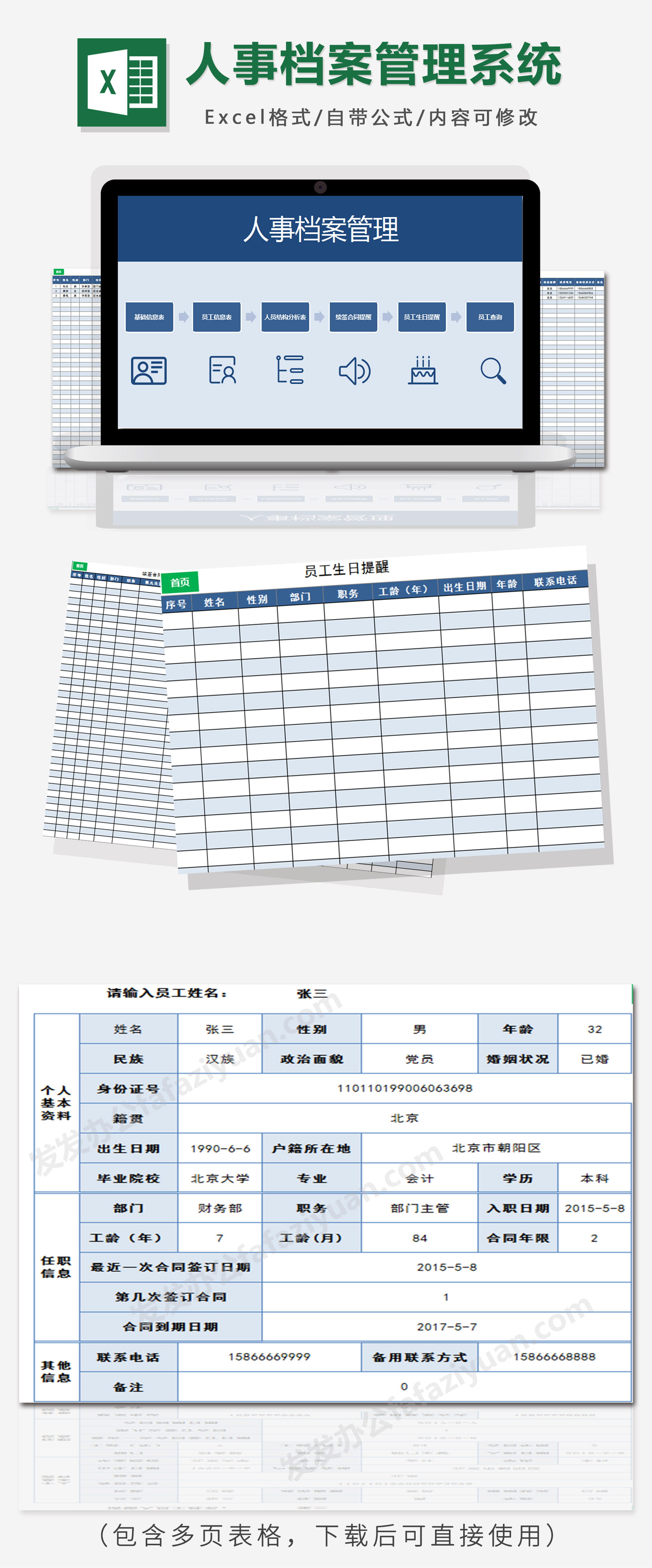 作品内容为人事档案管理系统excel表格模板, 格式为 xlsx, 大小0.31MB,包含多页表格,下载后可直接使用, 请使用软件Excel打开, 作品中主体文字及图片可替换修改,文字修改可直接点击文本框进行编辑,图片更改可选中图片后单击鼠标右键选择更换图片,也可根据自身需求增加和删除作品中的内容, 源文件无水印, 欢迎使用发发资源库。