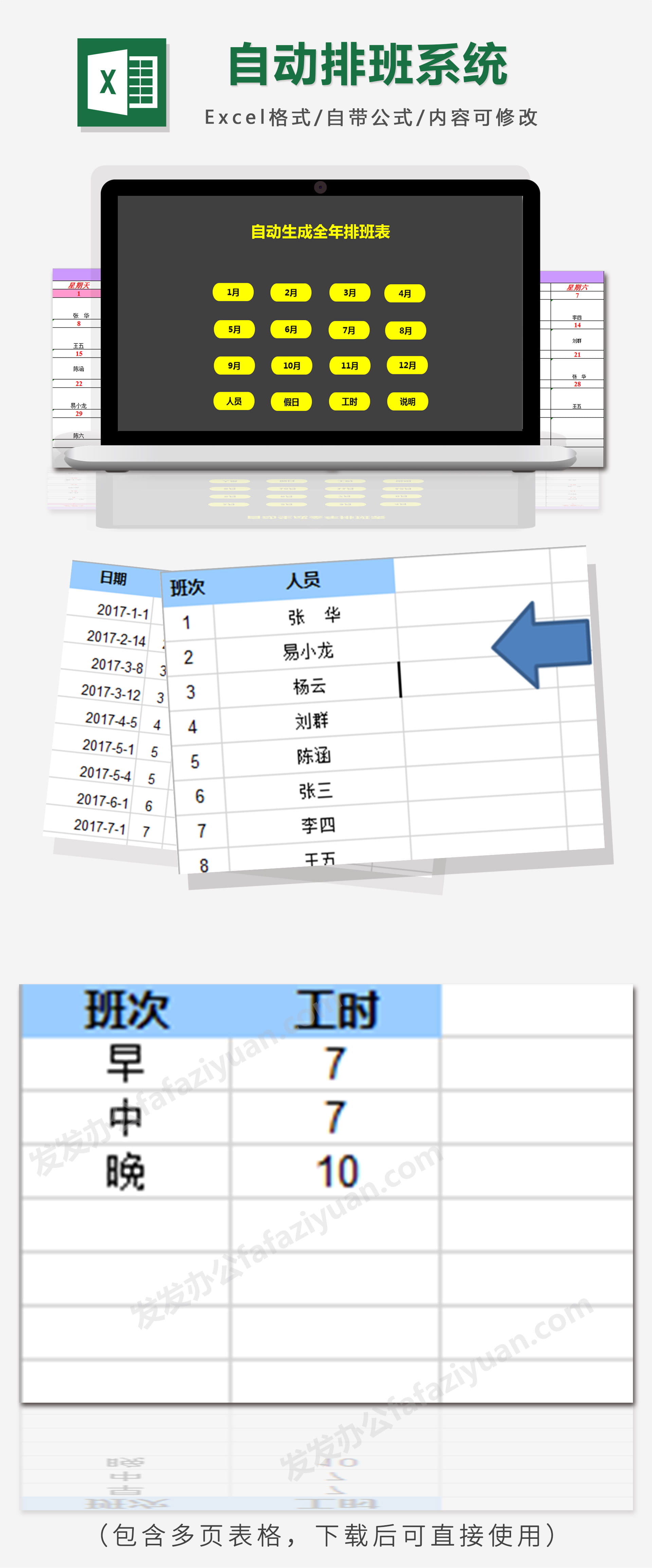作品内容为自动生成全年排班表系统excel表格模板, 格式为 xlsx, 大小0.11MB,包含多页表格,下载后可直接使用, 请使用软件Excel打开, 作品中主体文字及图片可替换修改,文字修改可直接点击文本框进行编辑,图片更改可选中图片后单击鼠标右键选择更换图片,也可根据自身需求增加和删除作品中的内容, 源文件无水印, 欢迎使用发发资源库。 资源下载此资源下载价格为8.8F币,VIP免费,请先登录