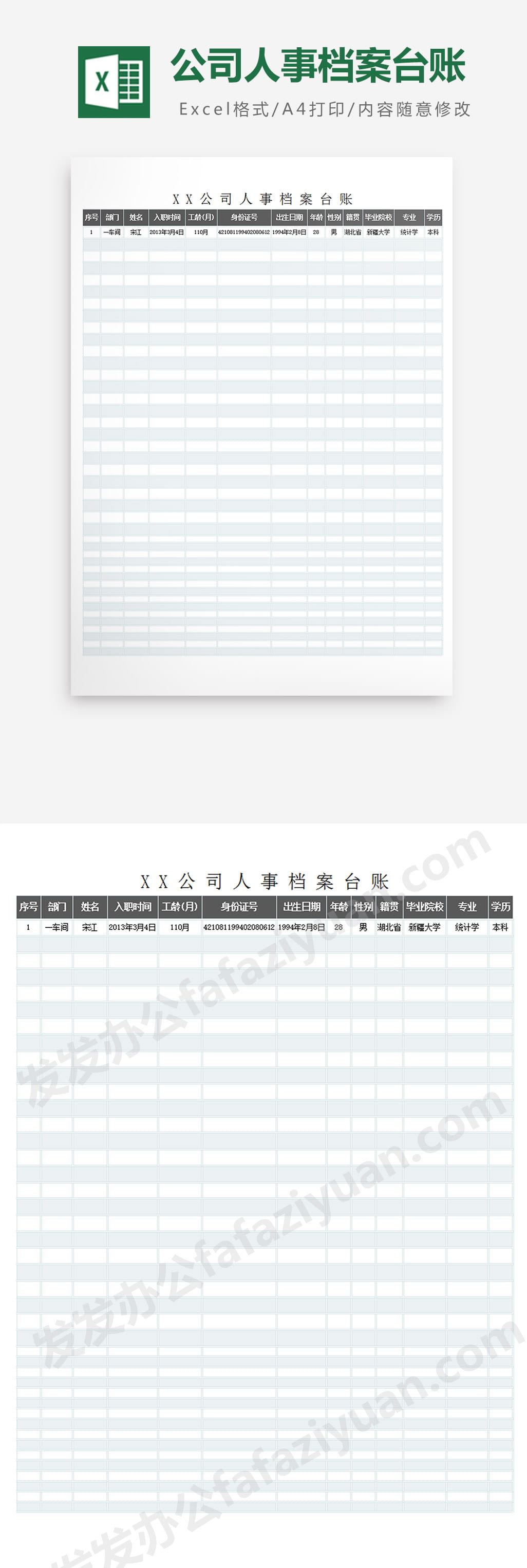 作品内容为公司人事档案台账档案管理Excel表格模板免费下载,格式为 xlsx,大小0.027MB,下载后可直接使用,请使用软件Excel打开,作品中主体文字及图片可替换修改,文字修改可直接点击文本框进行编辑,图片更改可选中图片后单击鼠标右键选择更换图片,也可根据自身需求增加和删除作品中的内容,源文件无水印,欢迎使用发发资源库。