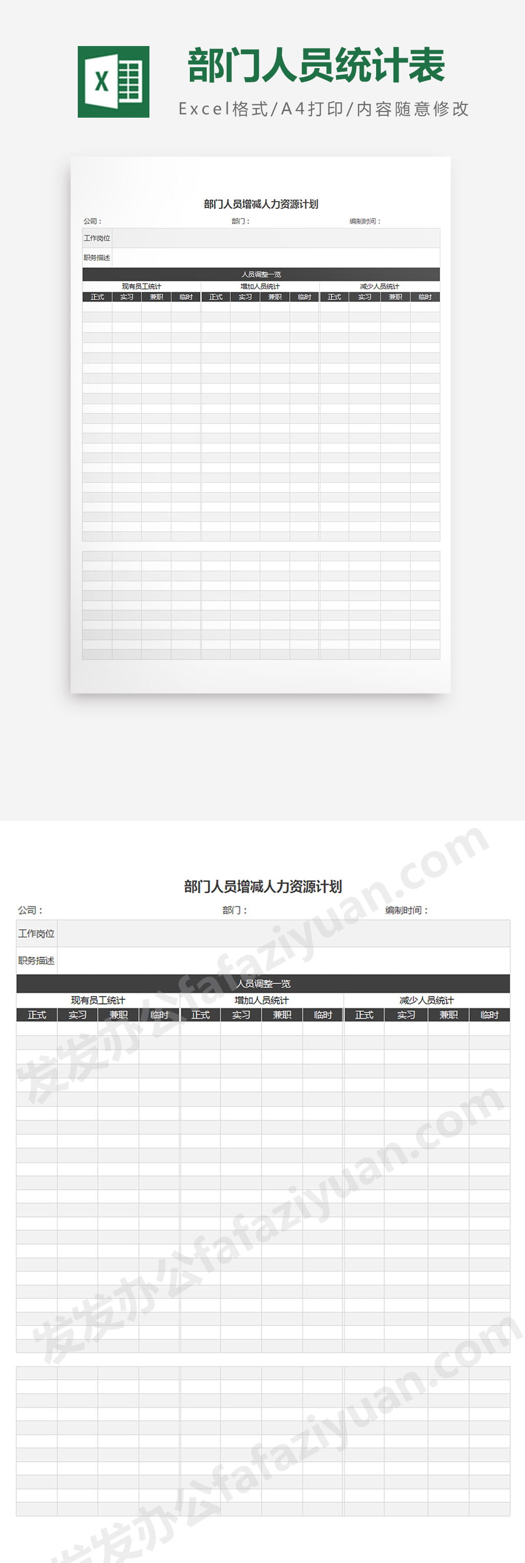 作品内容为部门人员增减统计表人力资源计划excel表格模板,格式为 xlsx,大小0.014MB,下载后可直接使用,请使用软件Excel打开,作品中主体文字及图片可替换修改,文字修改可直接点击文本框进行编辑,图片更改可选中图片后单击鼠标右键选择更换图片,也可根据自身需求增加和删除作品中的内容,源文件无水印,欢迎使用发发资源库。