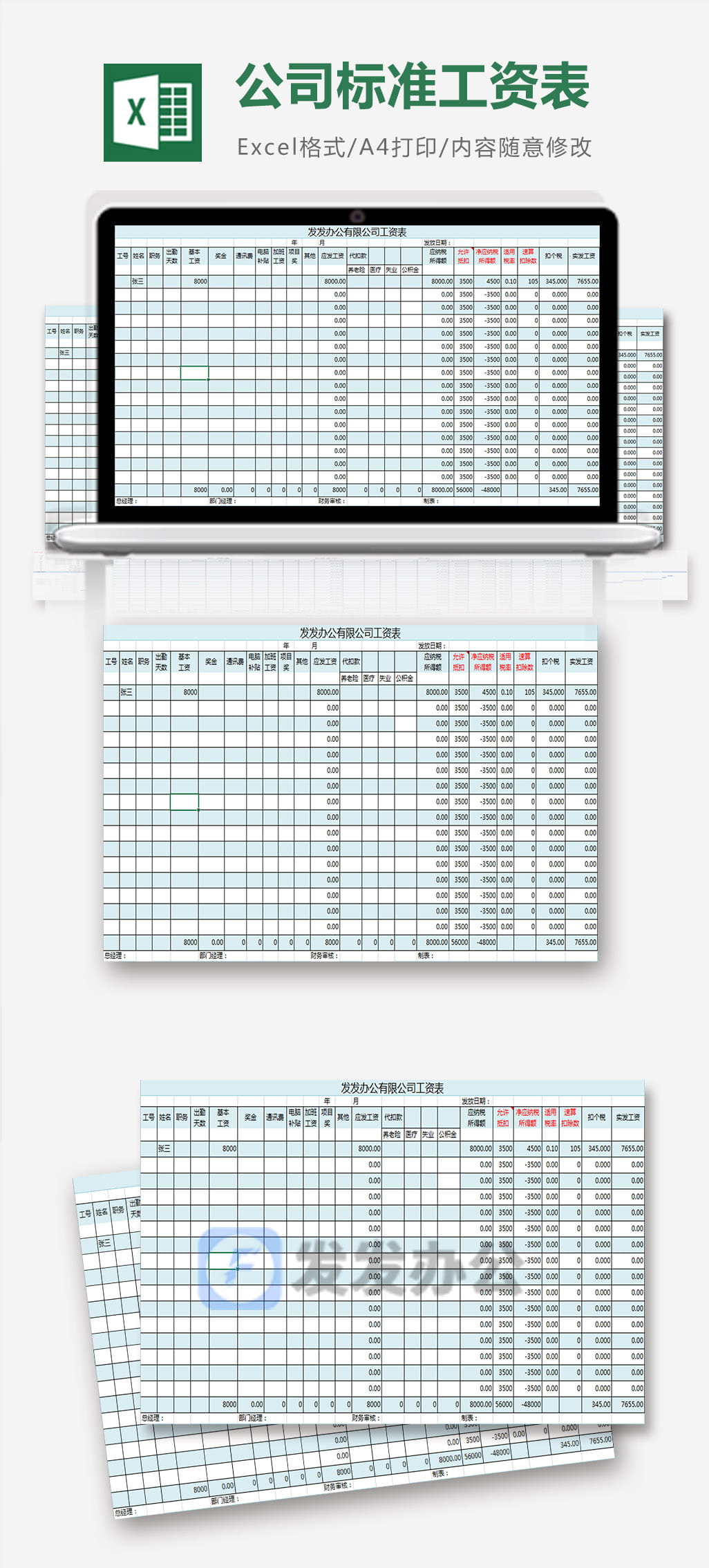 作品内容为公司标准工资表excel表格模板, 格式为 xlsx, 大小0.018MB,下载后可直接使用, 请使用软件Excel打开, 作品中主体文字及图片可替换修改,文字修改可直接点击文本框进行编辑,图片更改可选中图片后单击鼠标右键选择更换图片,也可根据自身需求增加和删除作品中的内容, 源文件无水印, 欢迎使用发发资源库。