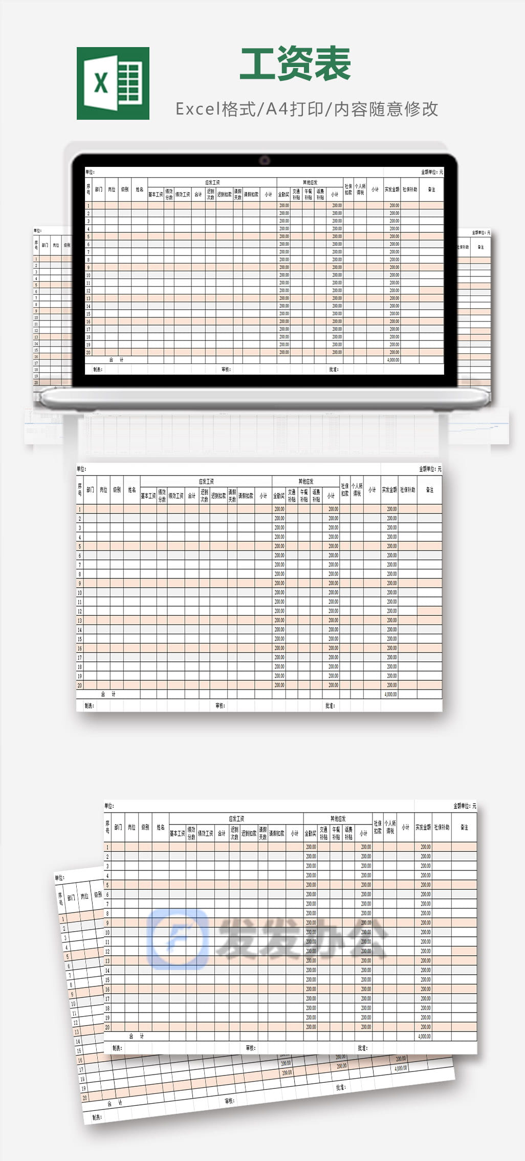作品内容为带全勤公式的月工资表excel表格模板, 格式为 xlsx, 大小0.017MB,下载后可直接使用, 请使用软件Excel打开, 作品中主体文字及图片可替换修改,文字修改可直接点击文本框进行编辑,图片更改可选中图片后单击鼠标右键选择更换图片,也可根据自身需求增加和删除作品中的内容, 源文件无水印, 欢迎使用发发资源库。