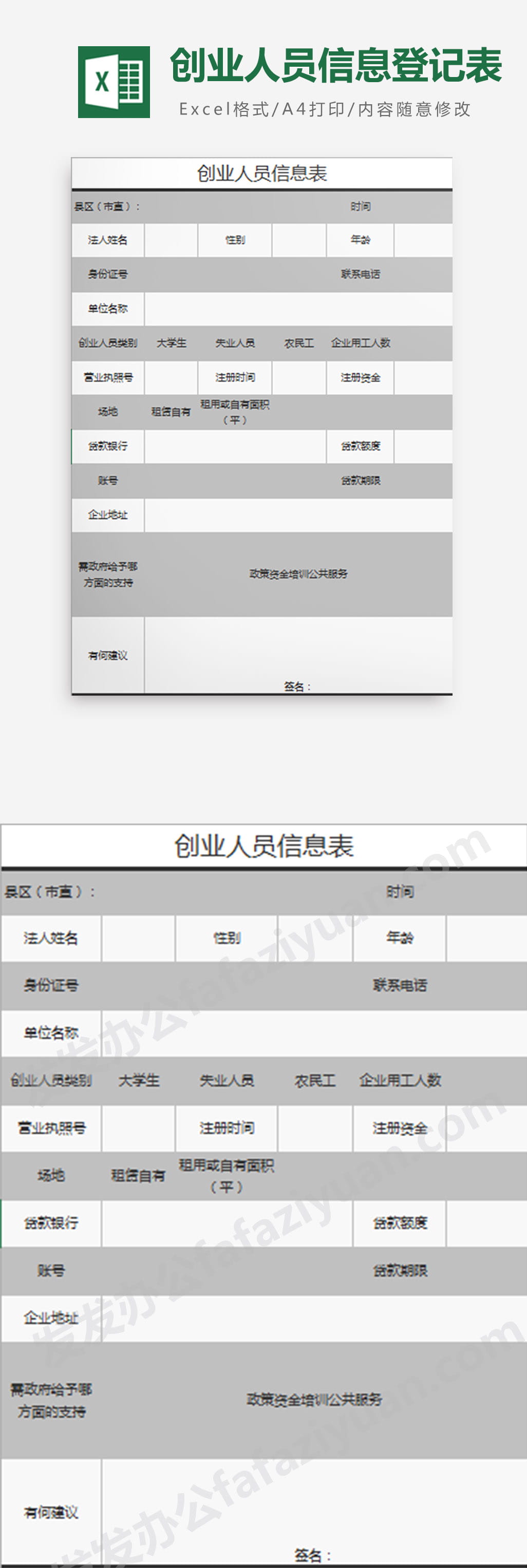 作品内容为创业人员信息登记表excel模板免费下载, 格式为 xlsx, 大小0.014MB,下载后可直接使用, 请使用软件Excel打开, 作品中主体文字及图片可替换修改,文字修改可直接点击文本框进行编辑,图片更改可选中图片后单击鼠标右键选择更换图片,也可根据自身需求增加和删除作品中的内容, 源文件无水印, 欢迎使用发发资源库。 资源下载此资源仅限注册用户下载,请先登录
