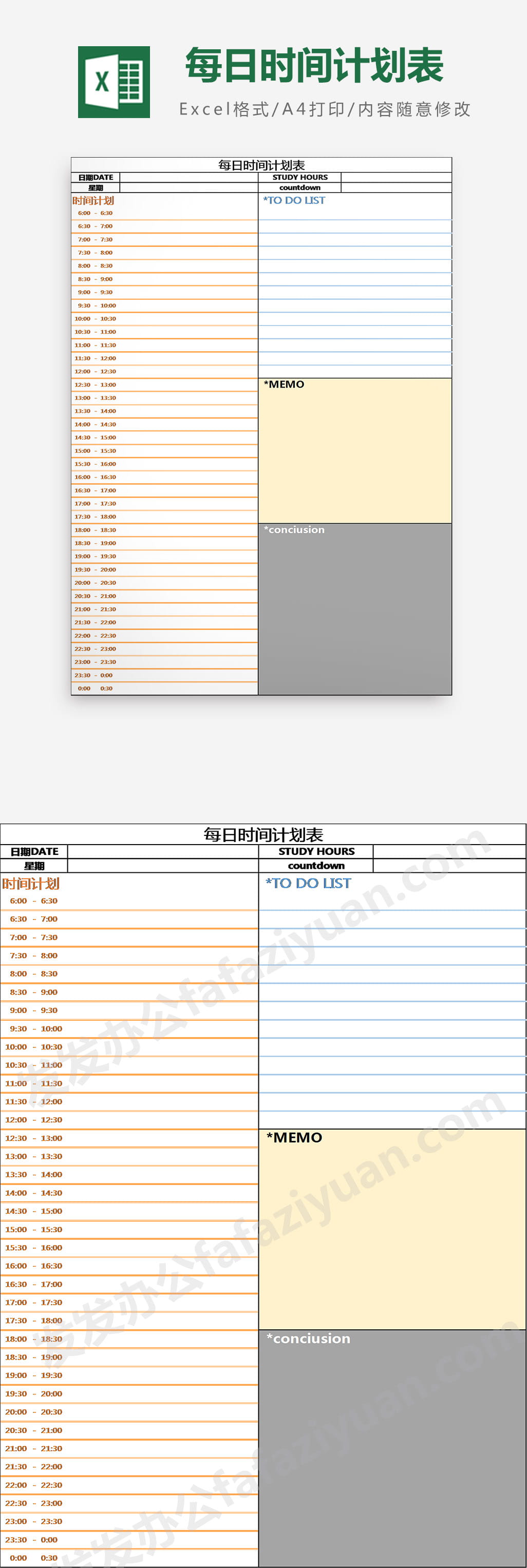 作品内容为每日时间计划表exce表格免费下载, 格式为 xlsx, 大小0.017MB,下载后可直接使用, 请使用软件Excel打开, 作品中主体文字及图片可替换修改,文字修改可直接点击文本框进行编辑,图片更改可选中图片后单击鼠标右键选择更换图片,也可根据自身需求增加和删除作品中的内容, 源文件无水印, 欢迎使用发发资源库。