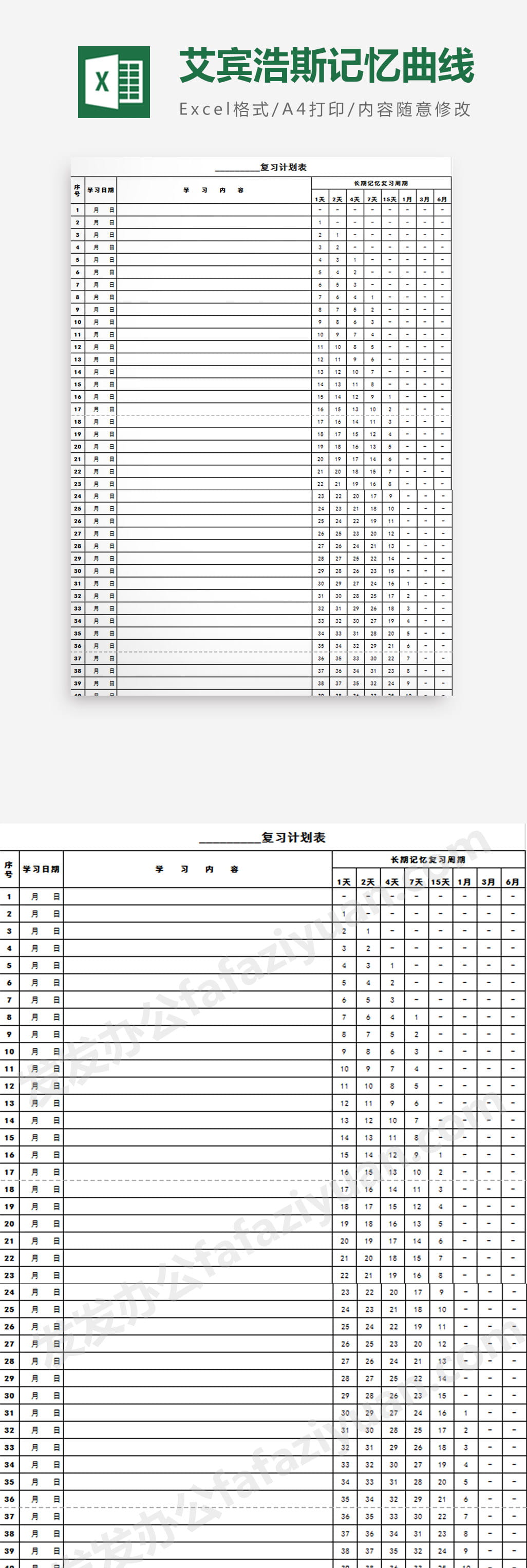 作品内容为艾宾浩斯记忆曲线学习规划excel表格免费下载, 格式为 xlsx, 大小0.033MB,下载后可直接使用, 请使用软件Excel打开, 作品中主体文字及图片可替换修改,文字修改可直接点击文本框进行编辑,图片更改可选中图片后单击鼠标右键选择更换图片,也可根据自身需求增加和删除作品中的内容, 源文件无水印, 欢迎使用发发资源库。