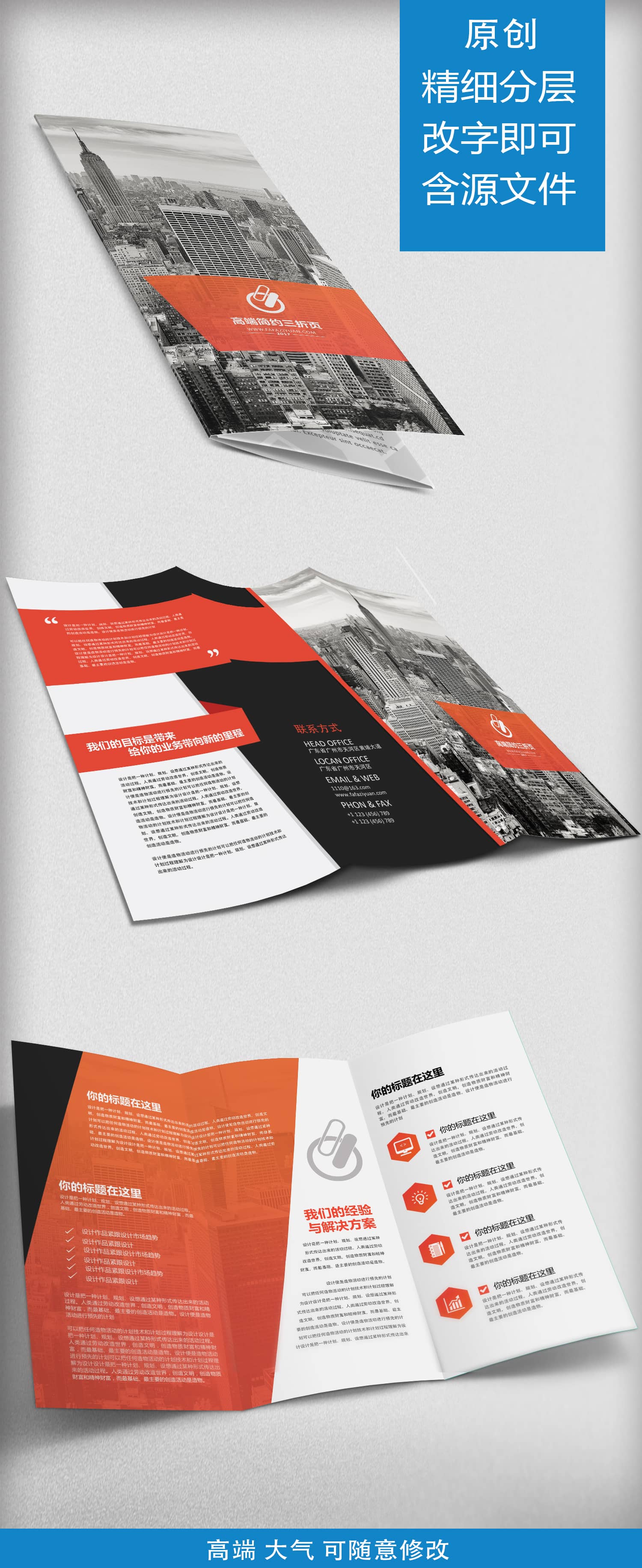 本作品内容为红色创意简约高端三折页PSD源文件, 格式为 psd, 大小120 MB,像素为3658 x 2633,分辨率为300dpi,请使用软件PhotoShop打开, 作品中文字及图片可替换修改, 源文件无水印, 欢迎使用发发资源库。