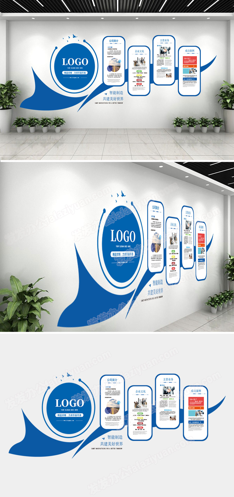 作品内容为蓝色创意企业文化墙, 格式为 ai, 大小201 MB, 作品中文字及图片可替换修改, 源文件无水印, 欢迎使用发发资源库。
