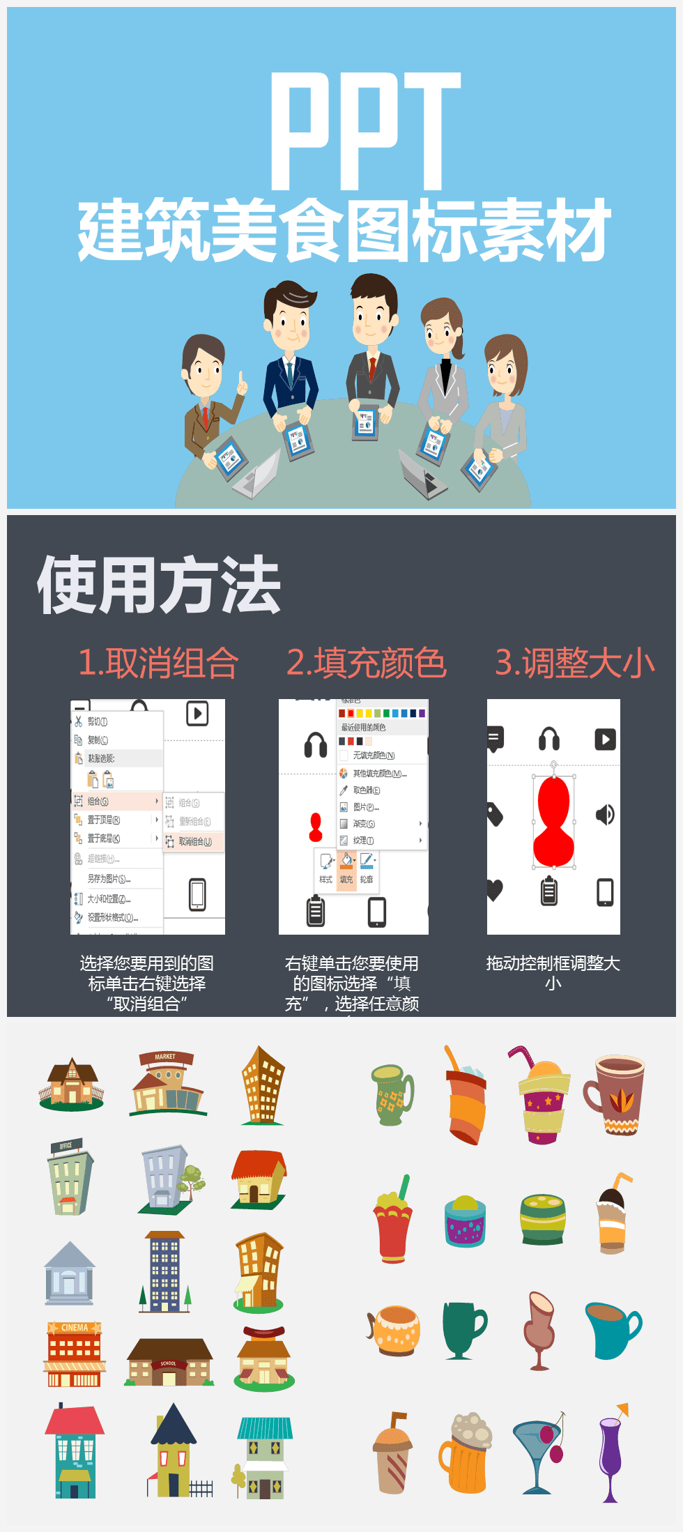 作品内容为彩色餐饮建筑餐饮美食PPT小图标PPT素材, 格式为 pptx,大小0.21MB, 页数为3,请使用软件PowerPoint打开,作品中PNG图片为免抠图片,源文件无水印,可以直接使用,欢迎使用发发资源库。