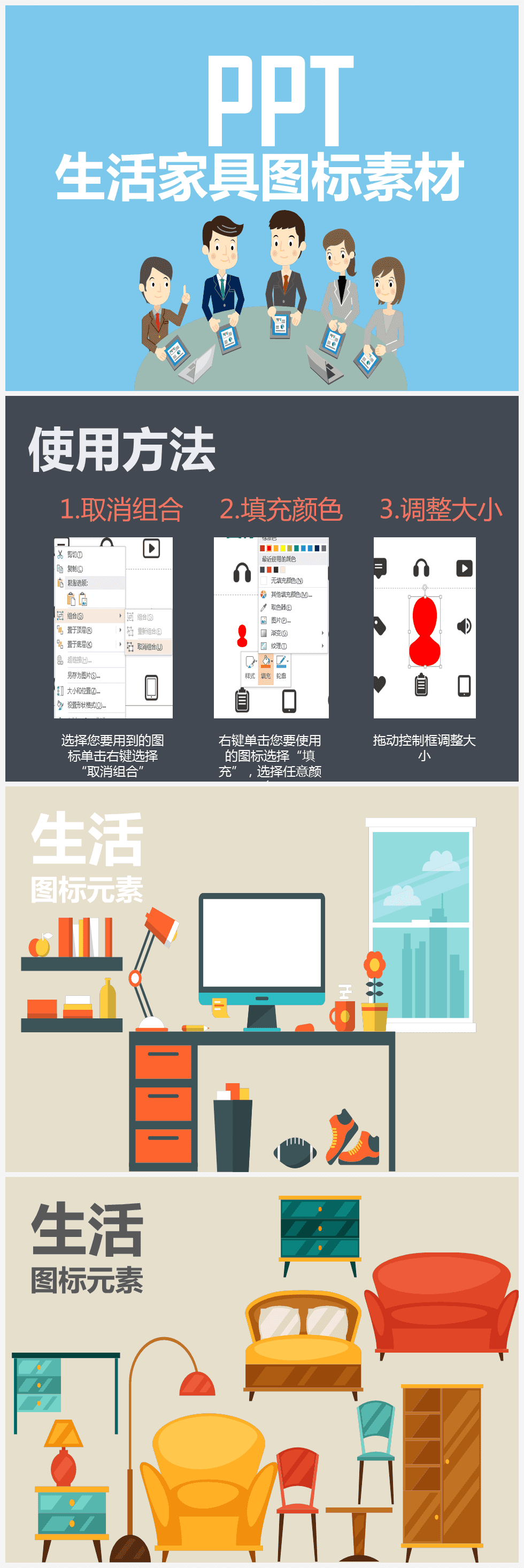 作品内容为生活家具元素PPT小图标PPT素材, 格式为 pptx,大小0.22MB, 页数为4,请使用软件PowerPoint打开,作品中PNG图片为免抠图片,源文件无水印,可以直接使用,欢迎使用发发资源库。