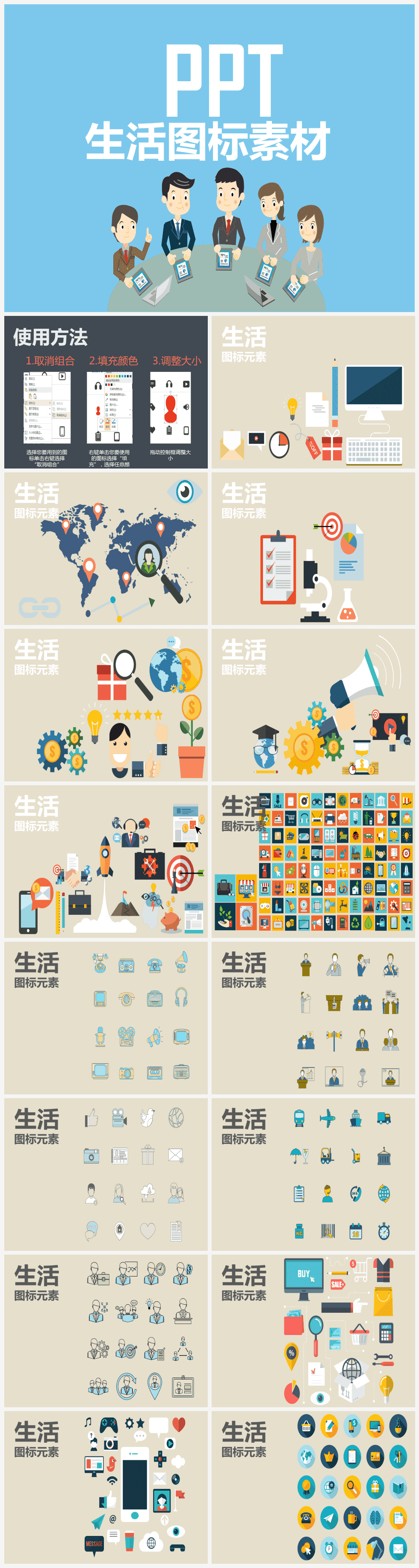 作品内容为生活图标元素PPT小图标PPT素材, 格式为 pptx,大小2.38MB, 页数为17,请使用软件PowerPoint打开,作品中PNG图片为免抠图片,源文件无水印,可以直接使用,欢迎使用发发资源库。