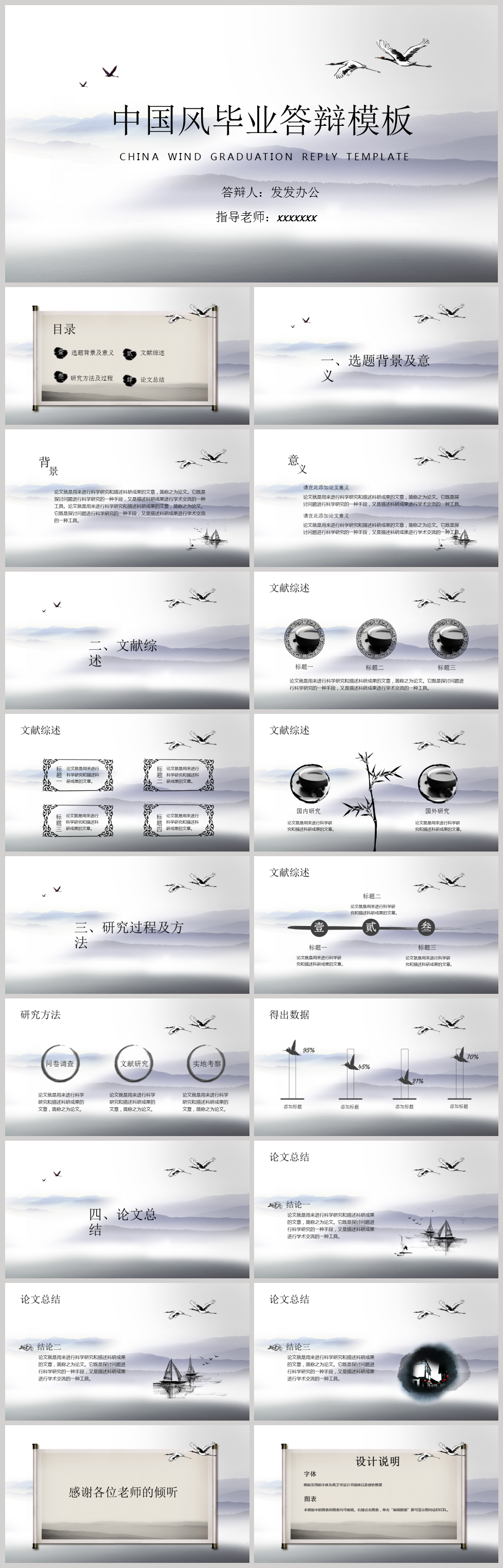 本作品内容为灰色中国风毕业答辩通用PPT模板, 格式为 pptx, 大小5.1 MB, 页数为19,比例16:9, 请使用软件PowerPoint打开, 作品中主体文字及图片可替换修改,文字修改可直接点击文本框进行编辑,图片更改可选中图片后单击鼠标右键选择更换图片,也可根据自身需求增加和删除作品中的内容, 源文件无水印, 欢迎使用发发资源库。 资源下载此资源下载价格为8.8F币,VIP免费,请先登录