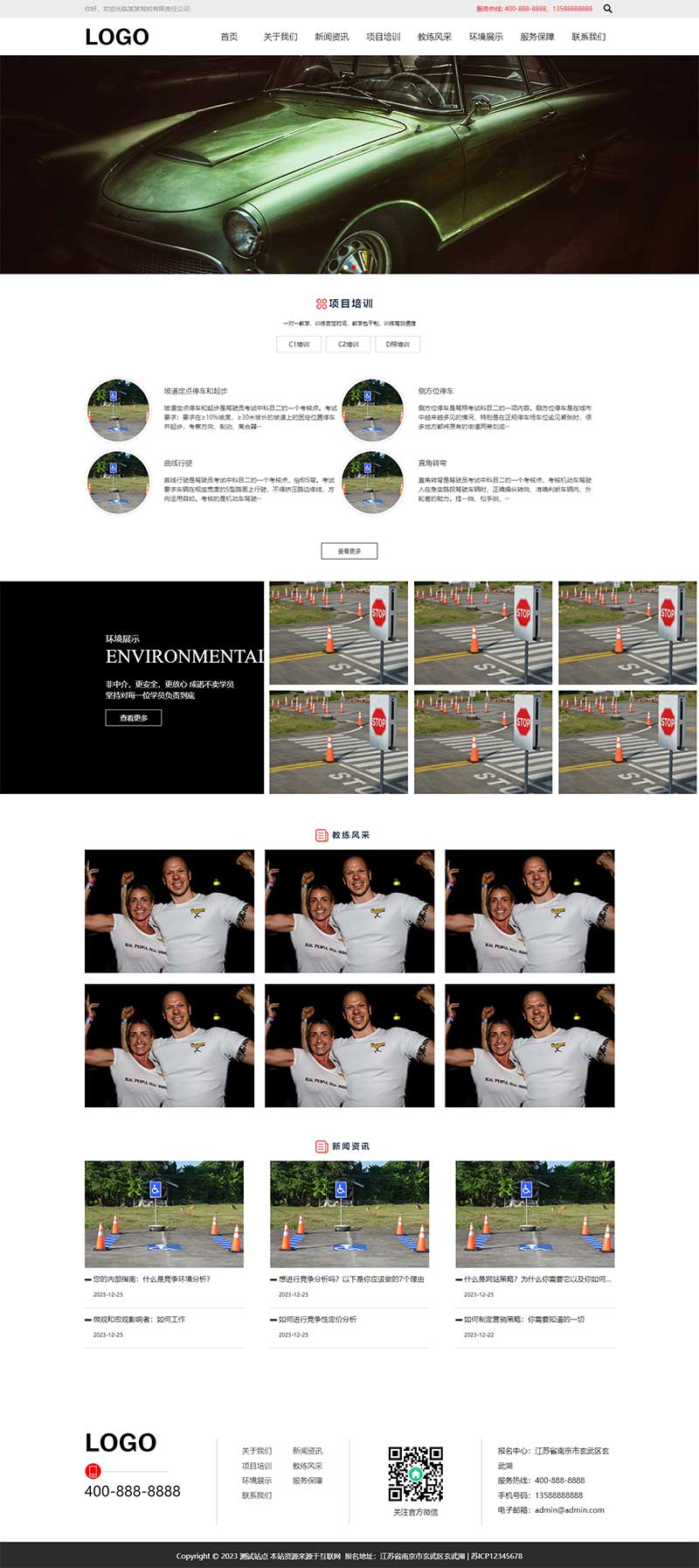 - 简约大气、贴合驾培行业调性的视觉设计 + 自适应手机版结构,融合前沿技术打造高端流畅体验,适配各类终端设备,完美呈现驾校实力、训练场地及课程优势,提升学员信任感;