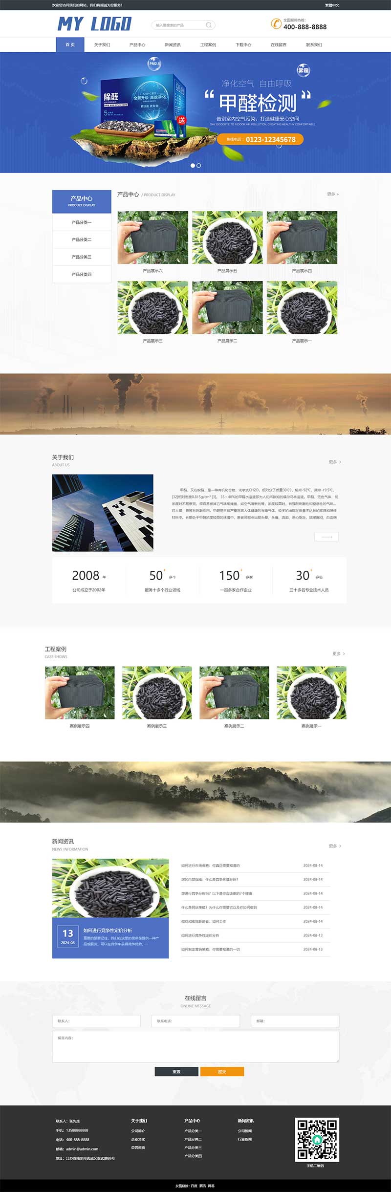 模板支持 HTML5 响应式 + 自适应手机端双重适配,全面兼容手机端、PC 端、平板等各类终端,同一个后台集中管理,双端数据即时同步更新,操作简单易上手,企业工作人员无需专业技术基础,就能快速熟练操作。贴合家装业主、企业行政人员、物业负责人的使用习惯 —— 用户手机端可快速了解甲醛检测服务、查询检测收费、一键预约检测时间、对接客服咨询,操作简单便捷,适配业主随时预约、紧急咨询的需求,无需繁琐操作就能完成服务对接;电脑端可详细查看检测资质、治理技术、工程案例、检测报告样本、合作方案,界面规整专业、重点突出,既凸显企业的检测实力与专业性,也能全面展示甲醛检测的严谨性、治理方案的科学性,快速提升客户信任感,打消客户对室内空气质量的顾虑。