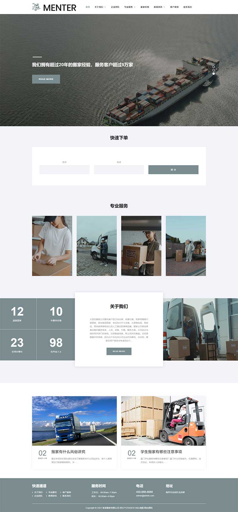 附带完整测试数据,安装后可直接预览网站整体宽屏大气布局、搬家案例、服务项目、报价标准及双端适配效果,快速熟悉搬家快递公司相关的核心内容与操作逻辑,无需手动添加测试内容,大幅节省搭建调试时间,降低企业建站成本。