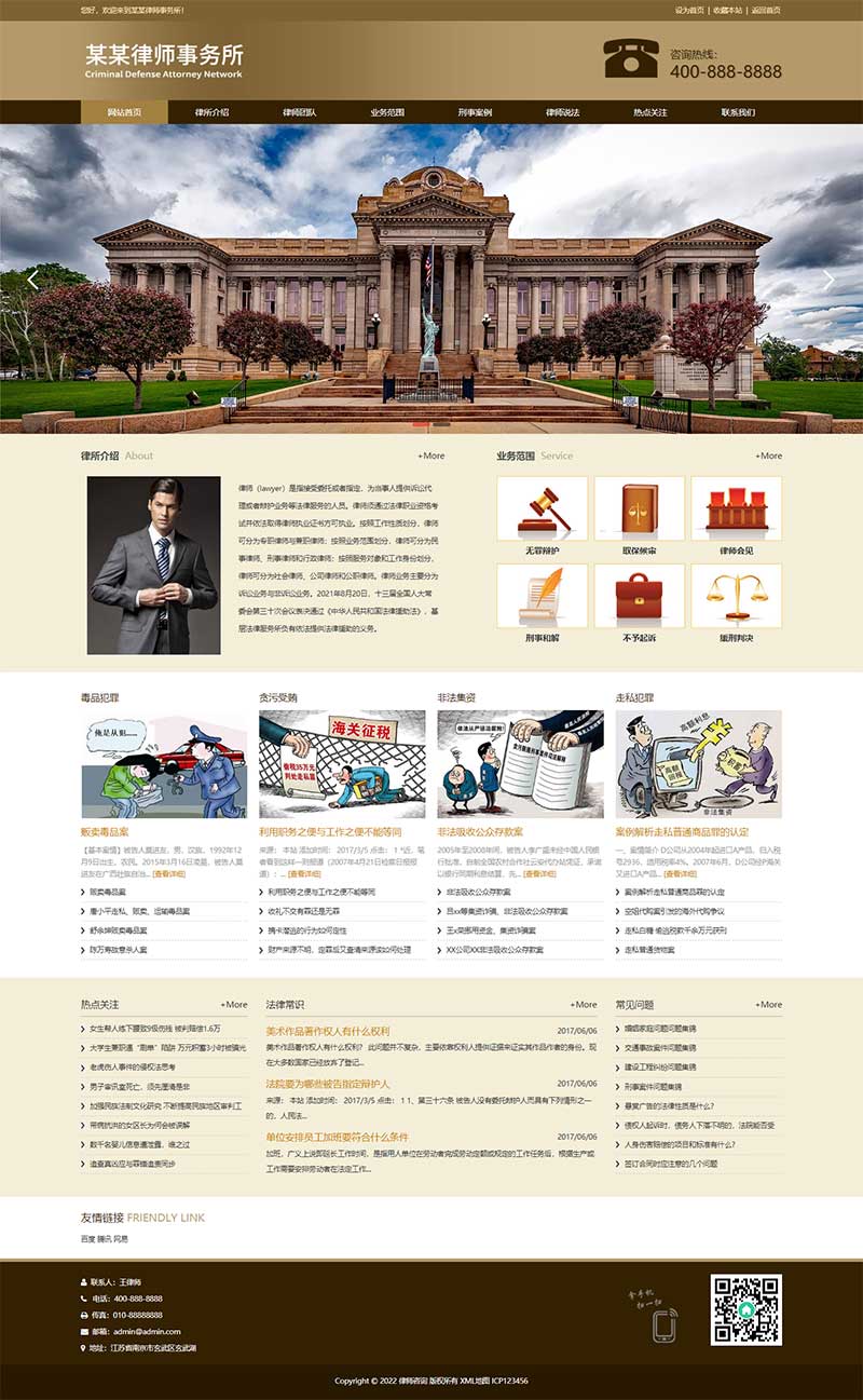 - 后台直接修改联系方式、传真、邮箱、地址等,同时可便捷更新律师信息、刑事辩护案例、法律资讯、机构动态,修改更加方便,无需专业技术,适配刑事辩护律师事务所、法律资讯机构日常运营需求。