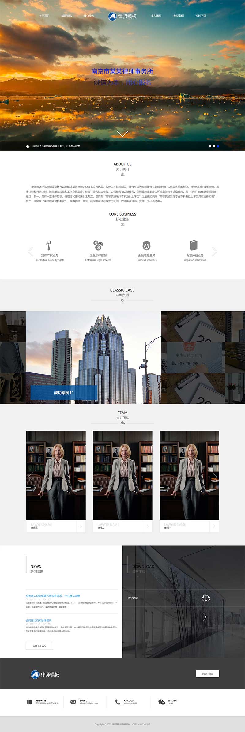 - 后台直接修改联系方式、传真、邮箱、地址等,同时可便捷更新律师信息、案件案例、法律资讯、律所动态,修改更加方便,无需专业技术,适配律师事务所、法律服务机构日常运营需求。