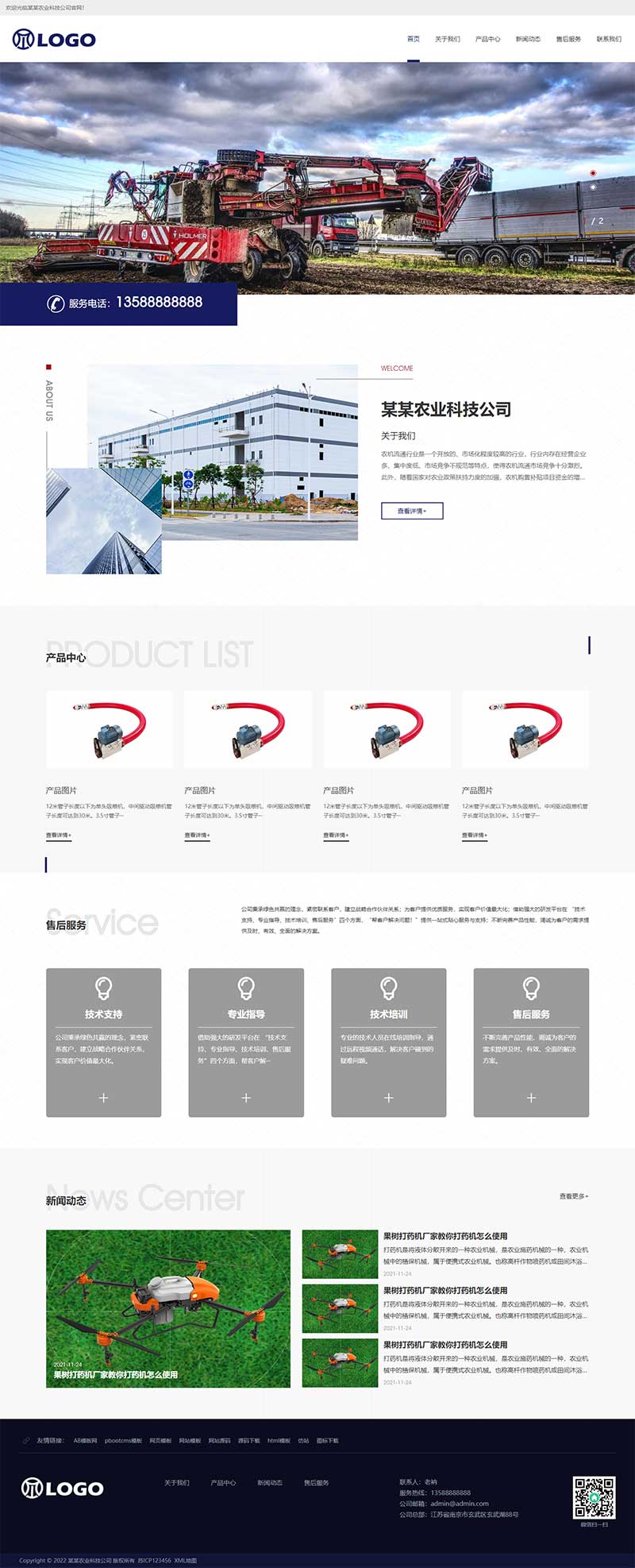 模板深度适配现代农业全产业链业务,可全面展示拖拉机、收割机、播种机、灌溉设备、农耕机械、农用配件等全系产品,同时支持企业实力展示、产品案例、技术方案、售后保障、新闻资讯等内容布局,完整满足农机企业品牌宣传、产品推广、客户咨询、线上引流的核心需求。