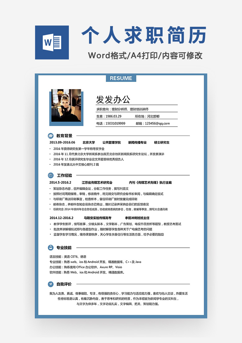 本作品内容为极简风理财分析师培训讲师求职简历个人简历word简历, 格式为 doc, 大小0.19 MB, 页数为1, 请使用软件Word打开, 作品中主体文字及图片可替换修改,文字修改可直接点击文本框进行编辑,图片更改可选中图片后单击鼠标右键选择更换图片,也可根据自身需求增加和删除作品中的内容, 源文件无水印, 欢迎使用发发资源库。 资源下载此资源下载价格为8.8F币,VIP免费,请先登录