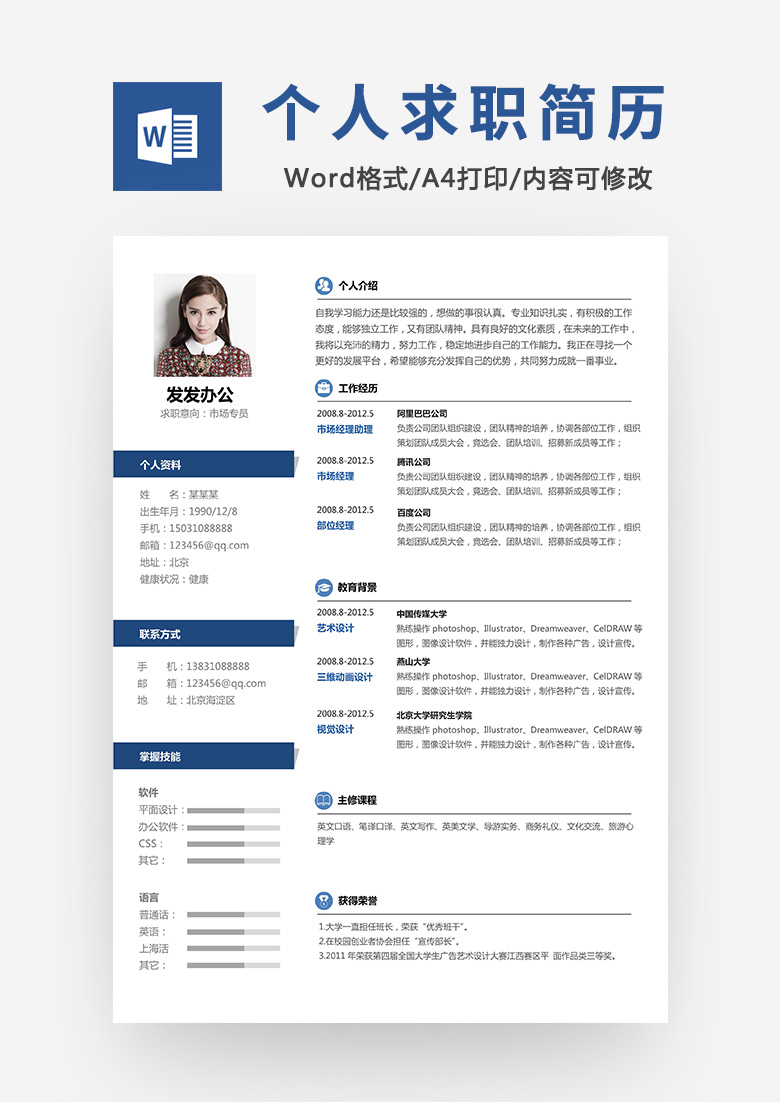 本作品内容为经典风格市场专员求职简历个人简历蓝色Word简历模板, 格式为 doc, 大小0.21 MB, 页数为1, 请使用软件Word打开, 作品中主体文字及图片可替换修改,文字修改可直接点击文本框进行编辑,图片更改可选中图片后单击鼠标右键选择更换图片,也可根据自身需求增加和删除作品中的内容, 源文件无水印, 欢迎使用发发资源库。