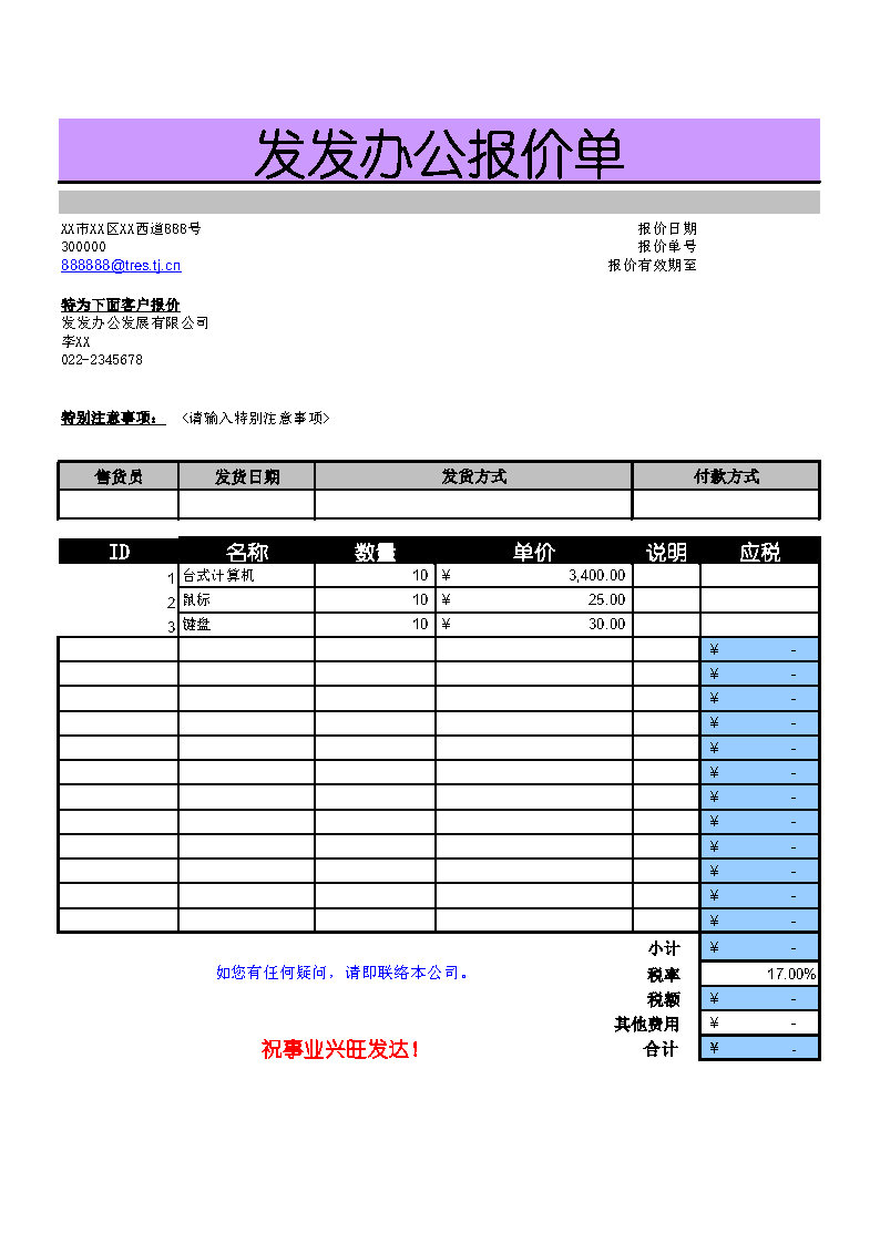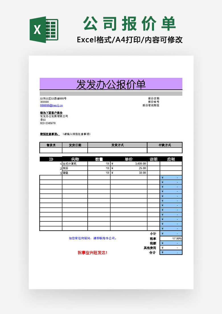本作品内容为公司产品购销报价单Excel表格模板报价单, 格式为 xlsx, 大小0.017 MB, 请使用软件Excel打开, 作品中主体文字及图片可替换修改,文字修改可直接点击文本框进行编辑,图片更改可选中图片后单击鼠标右键选择更换图片,也可根据自身需求增加和删除作品中的内容, 源文件无水印, 欢迎使用发发资源库。