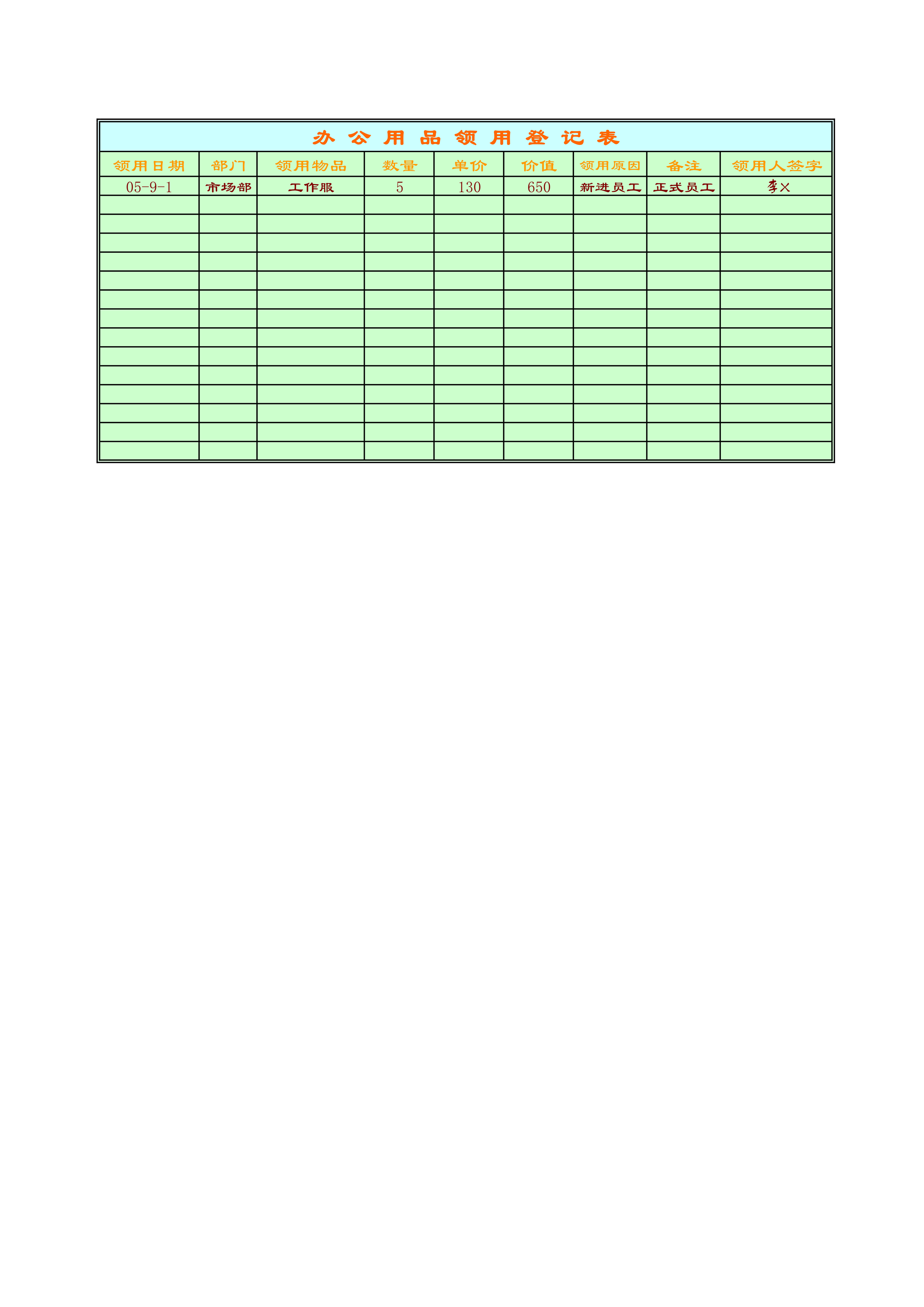 本作品内容为办公用品领用登记表Excel表格登记表, 格式为 xlsx, 大小0.011 MB, 请使用软件Excel打开, 作品中主体文字及图片可替换修改,文字修改可直接点击文本框进行编辑,图片更改可选中图片后单击鼠标右键选择更换图片,也可根据自身需求增加和删除作品中的内容, 源文件无水印, 欢迎使用发发资源库。 资源下载此资源下载价格为8.8F币,VIP免费,请先登录