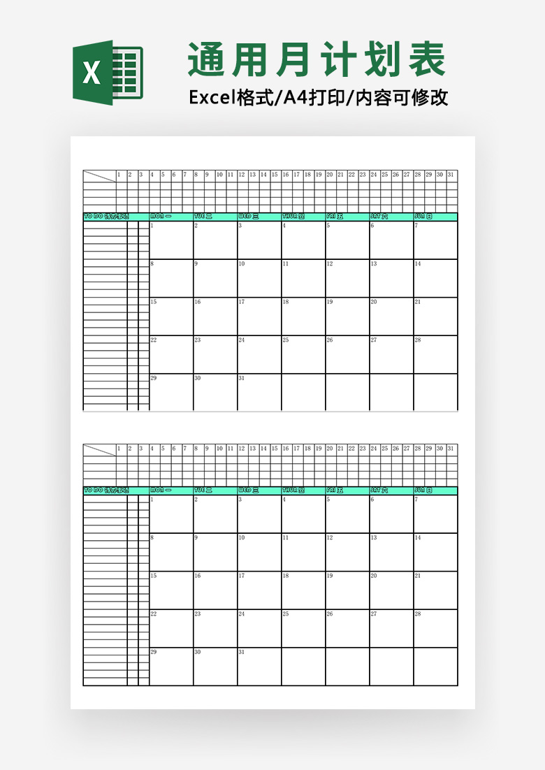 本作品内容为通用可选日期月计划表Excel表格模板, 格式为 xlsx, 大小0.015 MB, 请使用软件Excel打开, 作品中主体文字及图片可替换修改,文字修改可直接点击文本框进行编辑,图片更改可选中图片后单击鼠标右键选择更换图片,也可根据自身需求增加和删除作品中的内容, 源文件无水印, 欢迎使用发发资源库。 资源下载此资源下载价格为8.8F币,VIP免费,请先登录