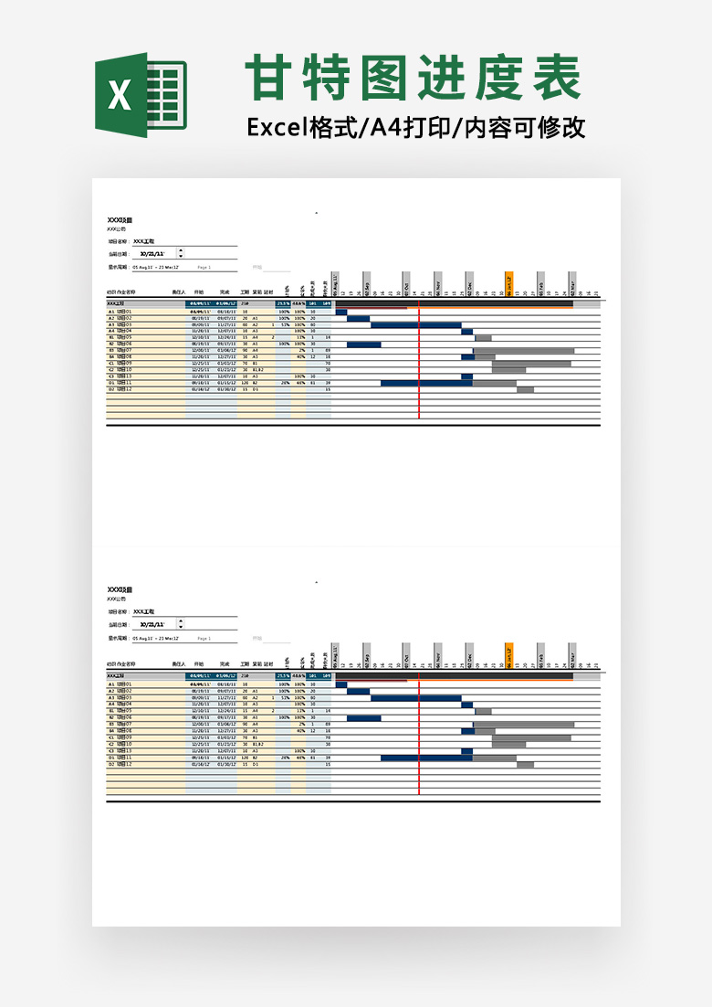 本作品内容为甘特图横道图进度表Excel表格模板, 格式为 xlsx, 大小0.043 MB, 请使用软件Excel打开, 作品中主体文字及图片可替换修改,文字修改可直接点击文本框进行编辑,图片更改可选中图片后单击鼠标右键选择更换图片,也可根据自身需求增加和删除作品中的内容, 源文件无水印, 欢迎使用发发资源库。