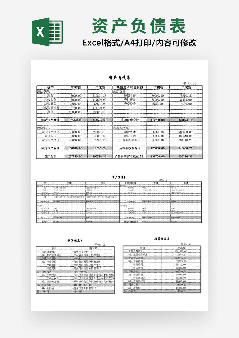 本作品内容为资产负债表Excel表格模板{内附损益表现金流量表汇总表}, 格式为 xlsx, 大小0.066 MB, 请使用软件Excel打开, 作品中主体文字及图片可替换修改,文字修改可直接点击文本框进行编辑,图片更改可选中图片后单击鼠标右键选择更换图片,也可根据自身需求增加和删除作品中的内容, 源文件无水印, 欢迎使用发发资源库。