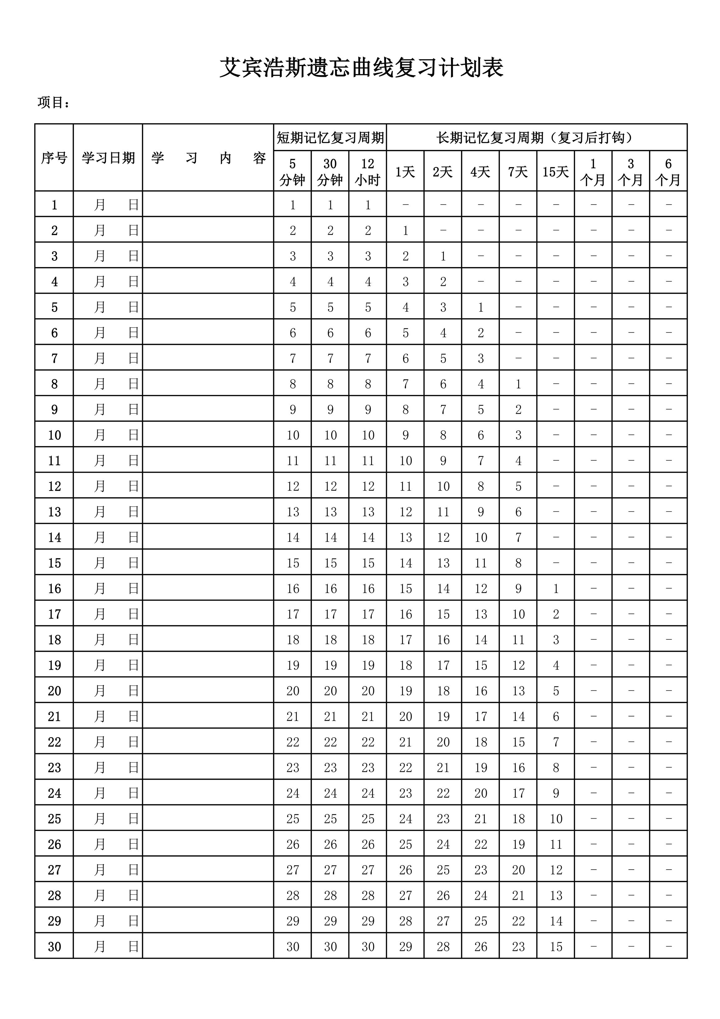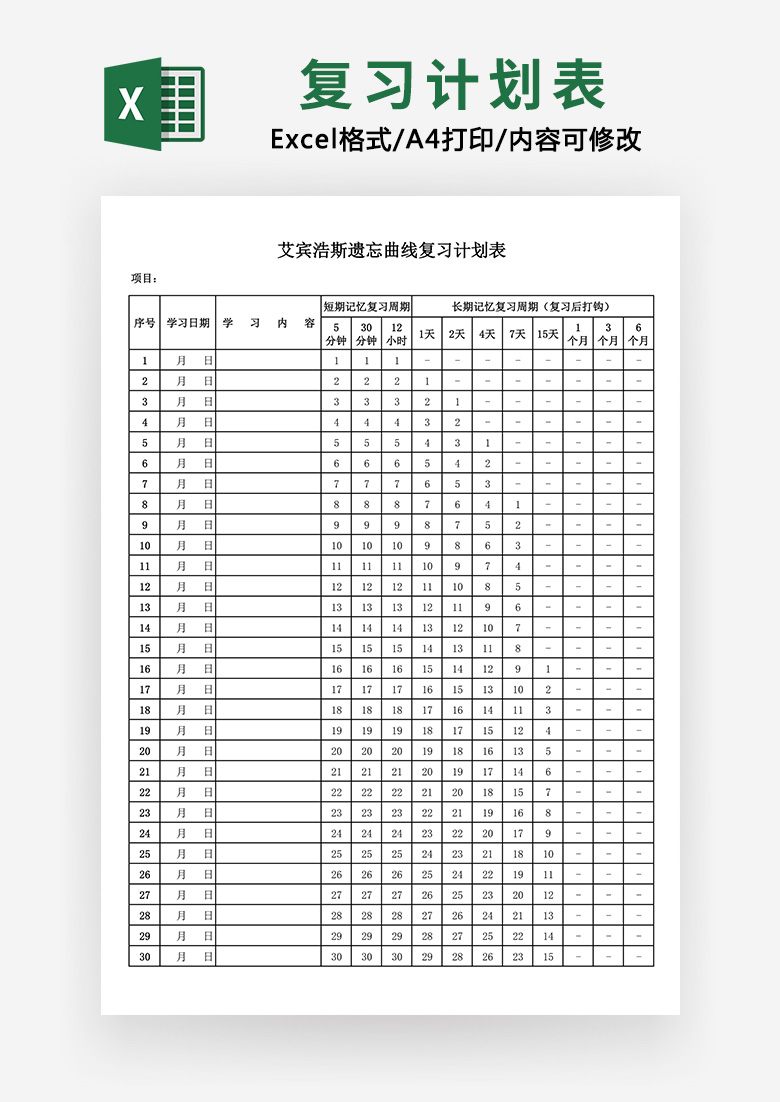 本作品内容为艾宾浩斯遗忘曲线复习计划表Excel表格模板, 格式为 xlsx, 大小0.031 MB, 请使用软件Excel打开, 作品中主体文字及图片可替换修改,文字修改可直接点击文本框进行编辑,图片更改可选中图片后单击鼠标右键选择更换图片,也可根据自身需求增加和删除作品中的内容, 源文件无水印, 欢迎使用发发资源库。 资源下载此资源下载价格为8.8F币,VIP免费,请先登录