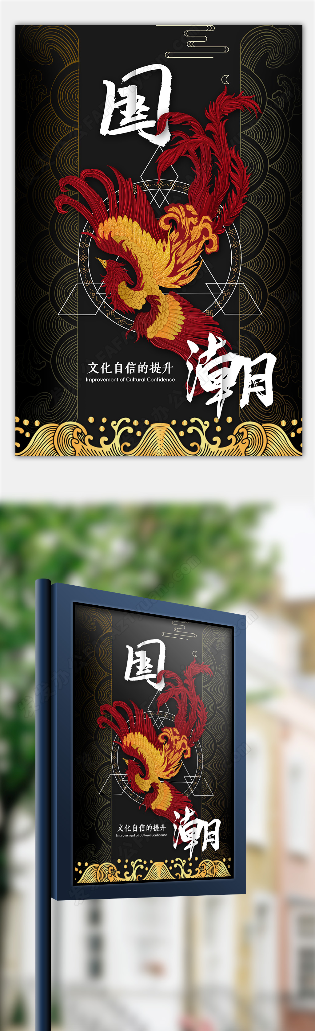 本作品内容为黑色创意火凤凰国潮文化自信提升宣传海报, 格式为 psd, 大小125 MB, 作品中文字及图片可替换修改, 源文件无水印, 欢迎使用发发资源库。