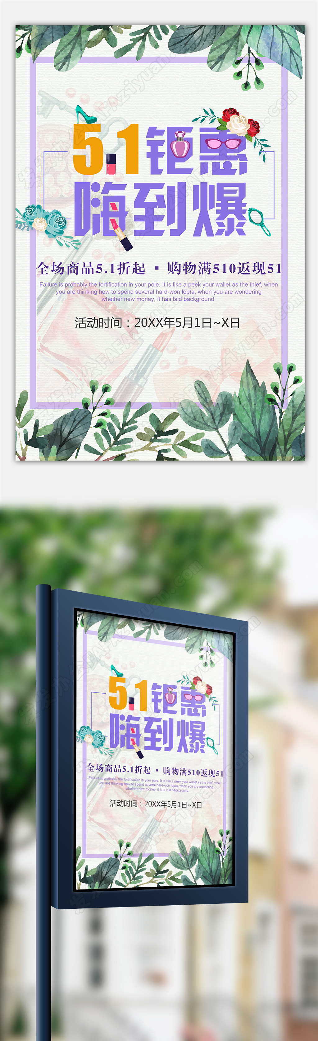 本作品内容为创意时尚51促销打折购物返现活动海报, 格式为 psd, 大小212 MB, 像素为7087 x 10630,请使用软件PhotoShop打开,作品中文字及图片可替换修改, 源文件无水印, 欢迎使用发发资源库。 资源下载此资源下载价格为8.8F币,VIP免费,请先登录
