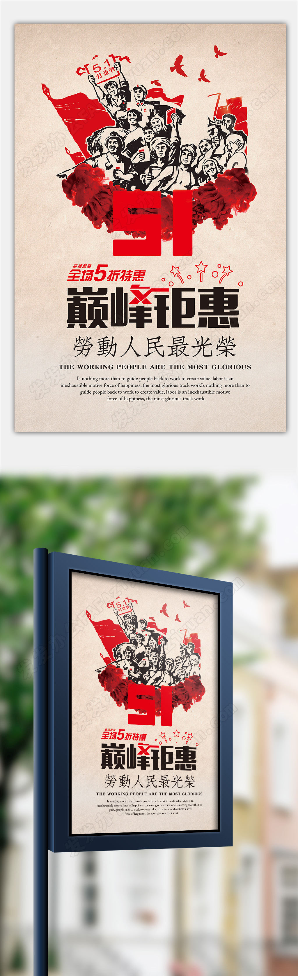 本作品内容为创意复古51劳动节促销钜惠活动海报, 格式为 psd, 大小393 MB, 像素为7087 x 10630,请使用软件PhotoShop打开,作品中文字及图片可替换修改, 源文件无水印, 欢迎使用发发资源库。