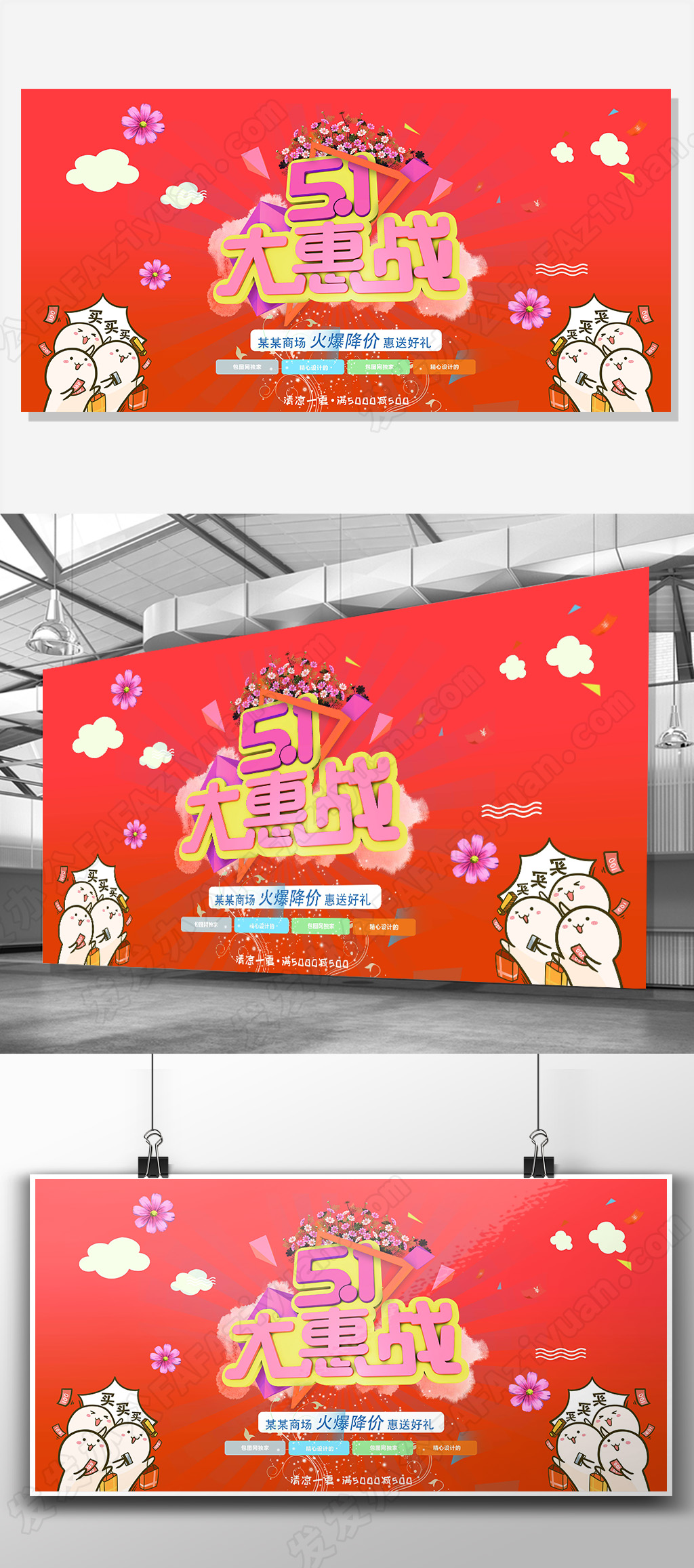 本作品内容为红色动感卡通51大惠战活动促销展板设计, 格式为 psd, 大小184 MB, 像素为4724 x 2362,分辨率为200dpi,请使用软件PhotoShop打开,作品中文字及图片可替换修改, 源文件无水印, 欢迎使用发发资源库。 资源下载此资源下载价格为8.8F币,VIP免费,请先登录
