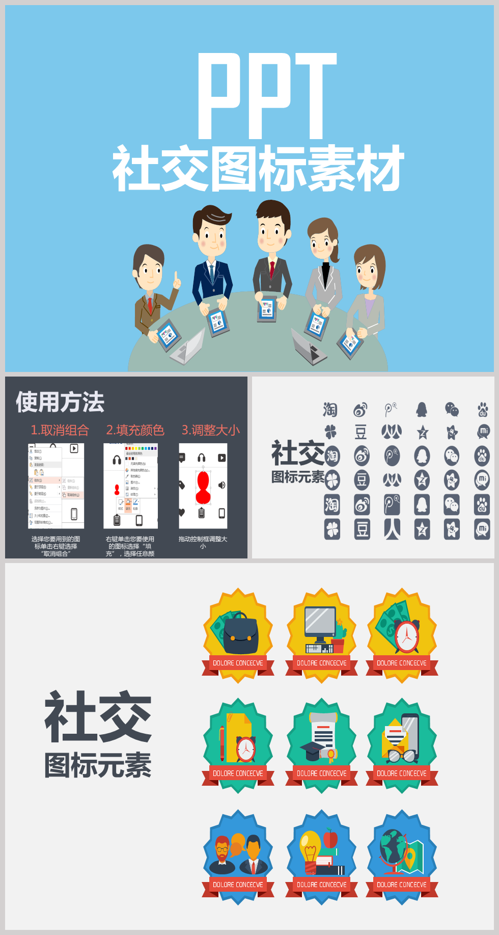 本作品内容为社交图标元素PPT小图标PPT素材, 格式为 pptx,大小0.42MB, 页数为4,请使用软件PowerPoint打开,作品中PNG图片为免抠图片,源文件无水印,可以直接使用,欢迎使用发发资源库。