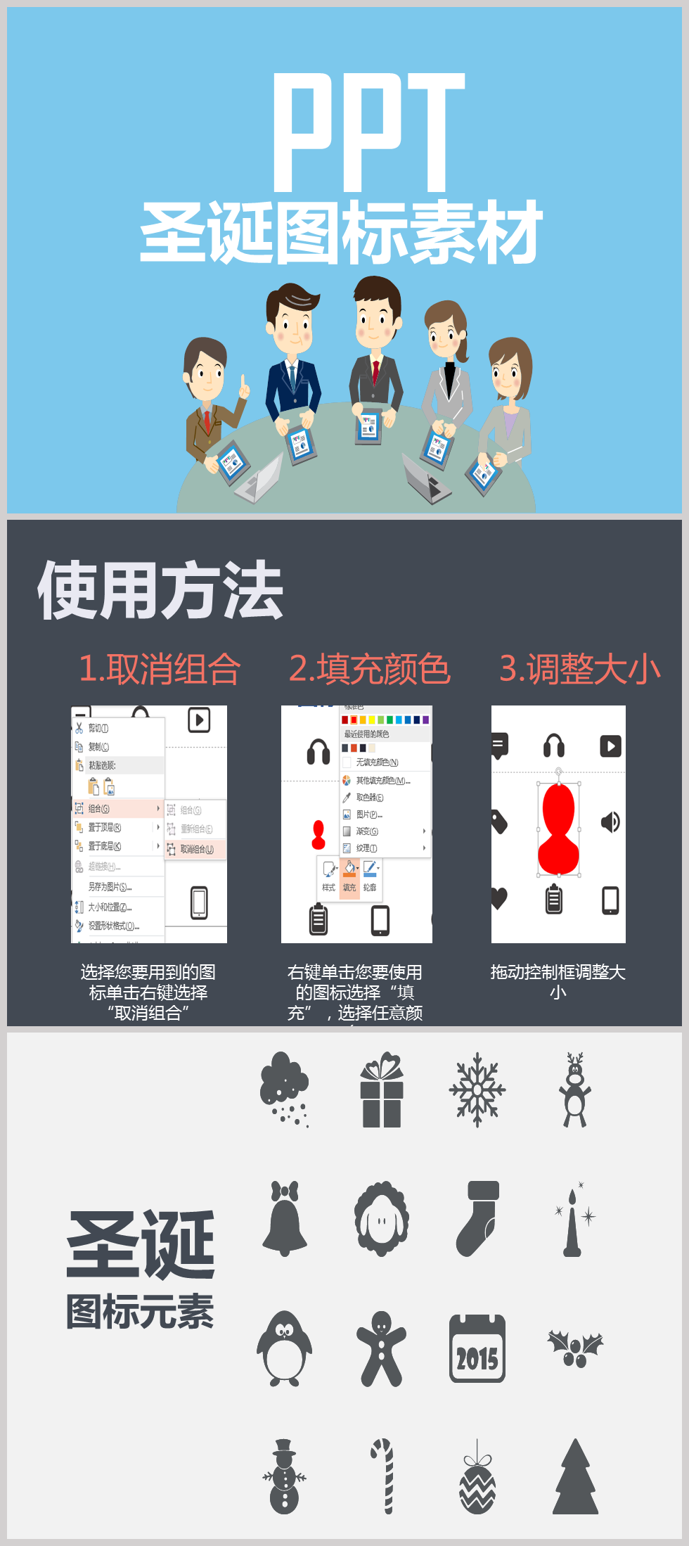 本作品内容为圣诞图标元素PPT小图标PPT素材, 格式为 pptx,大小0.26MB, 页数为3,请使用软件PowerPoint打开,作品中PNG图片为免抠图片,源文件无水印,可以直接使用,欢迎使用发发资源库。