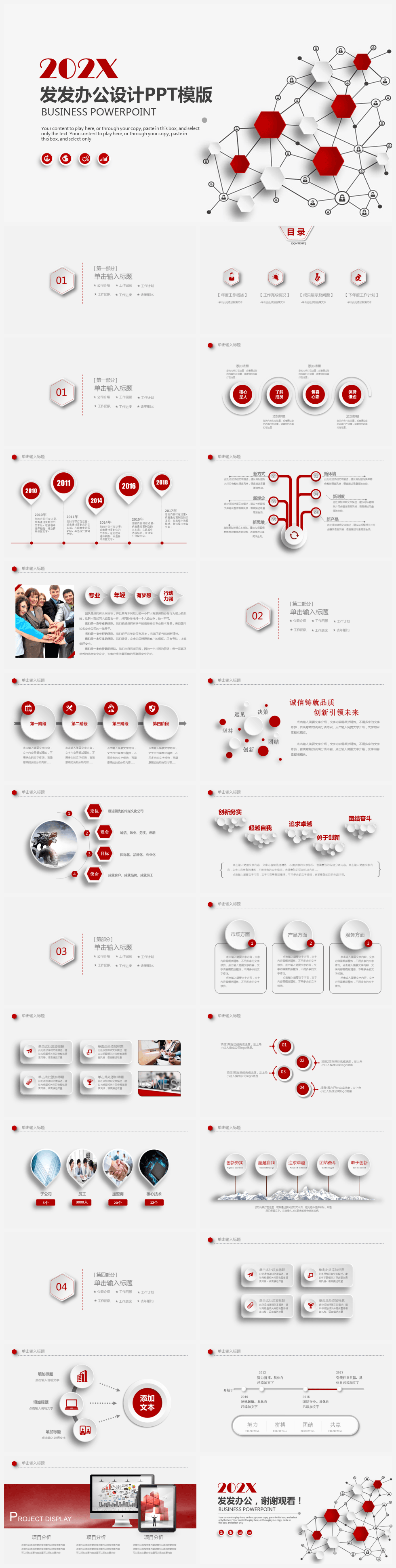 本作品内容为红色IOS风设计类述职报告PPT通用模板。 格式为 pptx, 大小2.37MB, 页数为25,比例16:9, 请使用软件PowerPoint打开, 作品中主体文字及图片可替换修改,文字修改可直接点击文本框进行编辑,图片更改可选中图片后单击鼠标右键选择更换图片,也可根据自身需求增加和删除作品中的内容, 源文件无水印, 欢迎使用发发资源库。