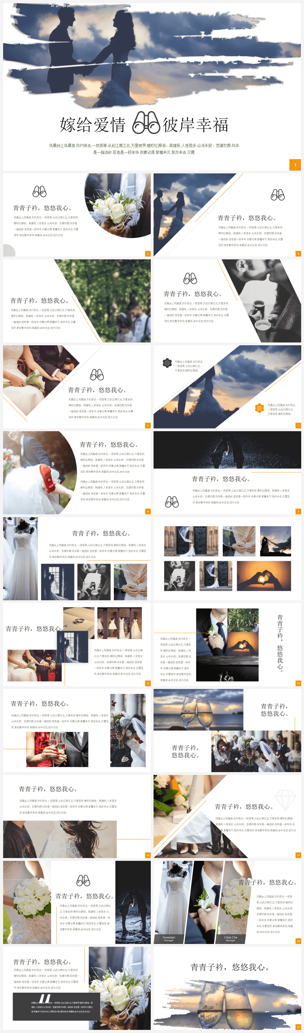 本作品内容为大气简约风嫁给爱情彼岸幸福浪漫婚庆PPT模板免费下载。 格式为 pptx, 大小17.3MB, 页数为21,比例自定义, 请使用软件PowerPoint打开, 作品中主体文字及图片可替换修改,文字修改可直接点击文本框进行编辑,图片更改可选中图片后单击鼠标右键选择更换图片,也可根据自身需求增加和删除作品中的内容, 源文件无水印, 欢迎使用发发资源库。