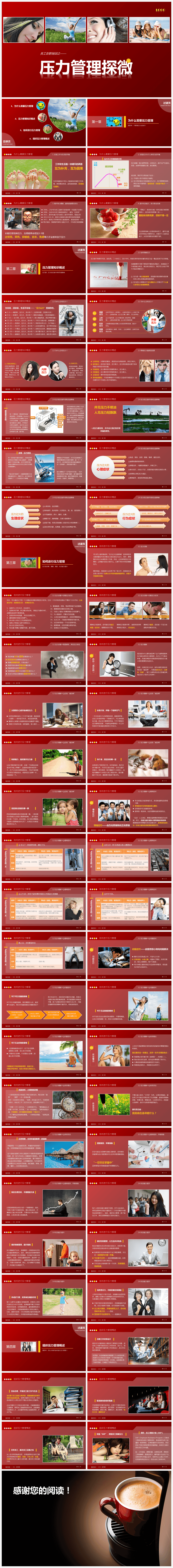 本作品内容为红色简约风员工在职培训压力管理培训课件PPT模板免费下载。 格式为 pptx, 大小7MB, 页数为58,比例自定义, 请使用软件PowerPoint打开, 作品中主体文字及图片可替换修改,文字修改可直接点击文本框进行编辑,图片更改可选中图片后单击鼠标右键选择更换图片,也可根据自身需求增加和删除作品中的内容, 源文件无水印, 欢迎使用发发资源库。 资源下载此资源仅限注册用户下载,请先登录